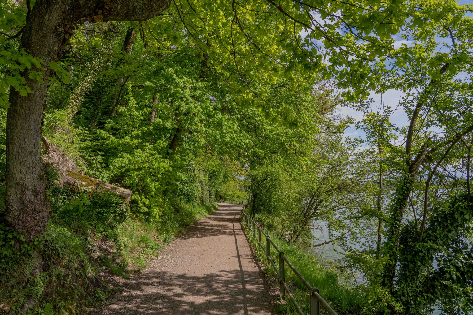 Nach kurzer Strecke durch schattigen Auwald führt der Radrundweg über einen schmalen Steg am Zollhaus vorbei und geht auf der Schweizer Seite des Rheins weiter. Wir radeln zunächst an mächtigen, efeubewachsenen Eichen und später am nationalen Schutzgebiet "Rossgarten" vorbei. Der Rossgarten ist Bestandteil des Auenschutzparks Aargau.