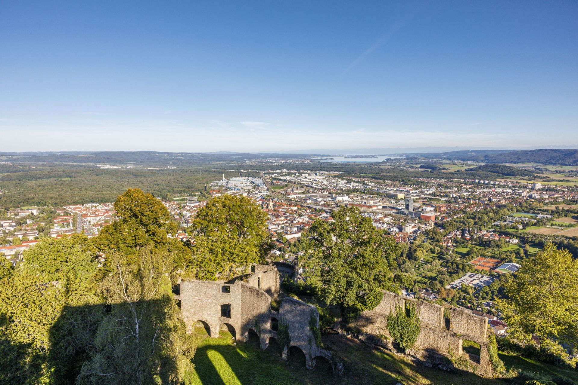 Der Blick von der Festungsruine Hohentwiel auf die Stadt Singen, den Untersee, den Hegau und die Alpen belohnt den anstrengenden Aufstieg!