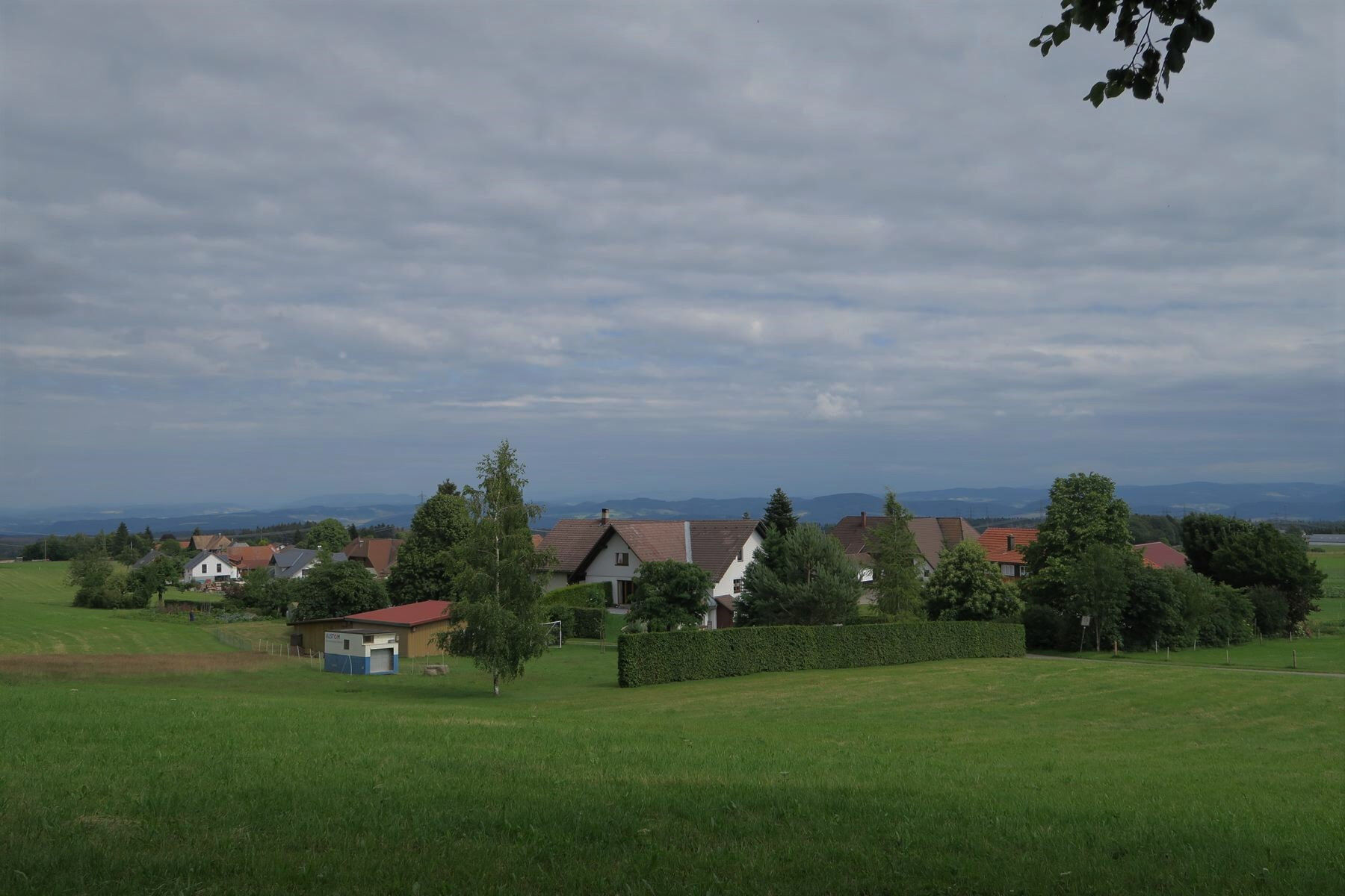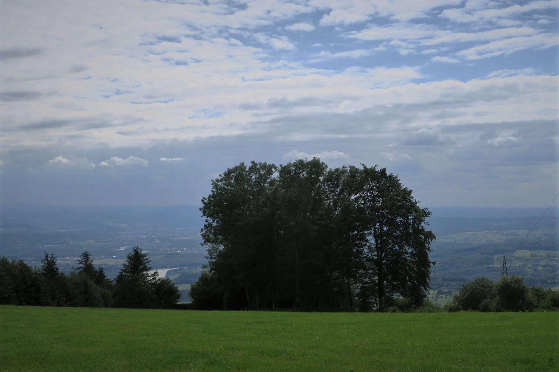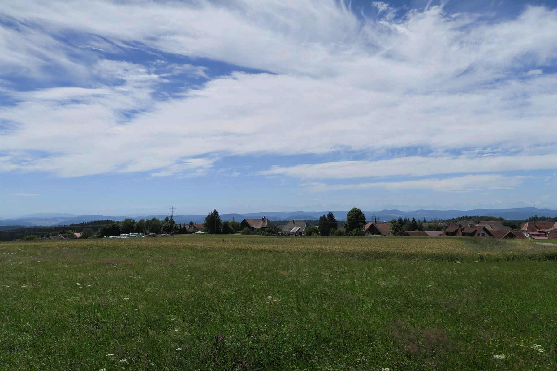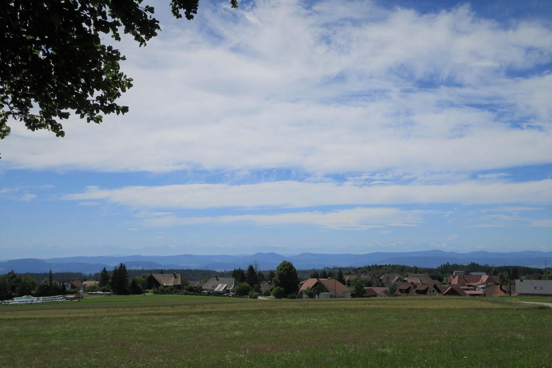 Nach einem kurzen Waldstück führt die Route zur Wegverzweigung Großer Stein, 891m. Hier halblinks und unter der Stromtrasse hindurch, dann können wir geradeaus einen kurzen Abstecher zu einem Aussichtspunkt unternehmen, der einen exzellenten Blick hinunter zum Hochrhein und über den Dinkelberg gewährt. Zurück auf dem Hauptweg achten wir in der Folge gut auf die gelben Rautenmarkierungen, die in diesem Abschnitt mit zusätzlichen Richtungspfeilen auf den Asphalt gemalt sind. Mit einigen Richtungswechseln gelangen wir am Wegpunkt Einschlag zum Ortsrand von Bergalingen, wo wir uns wieder einmal vom Wegenetz des Schwarzwaldvereins verabschieden.