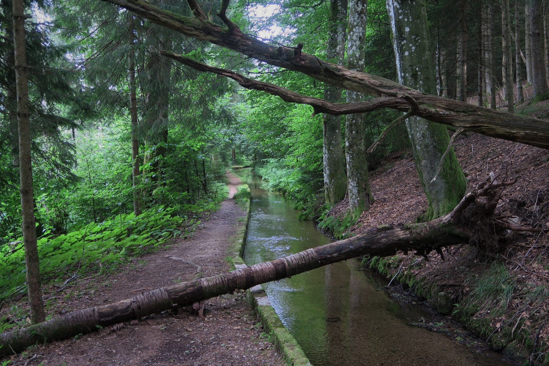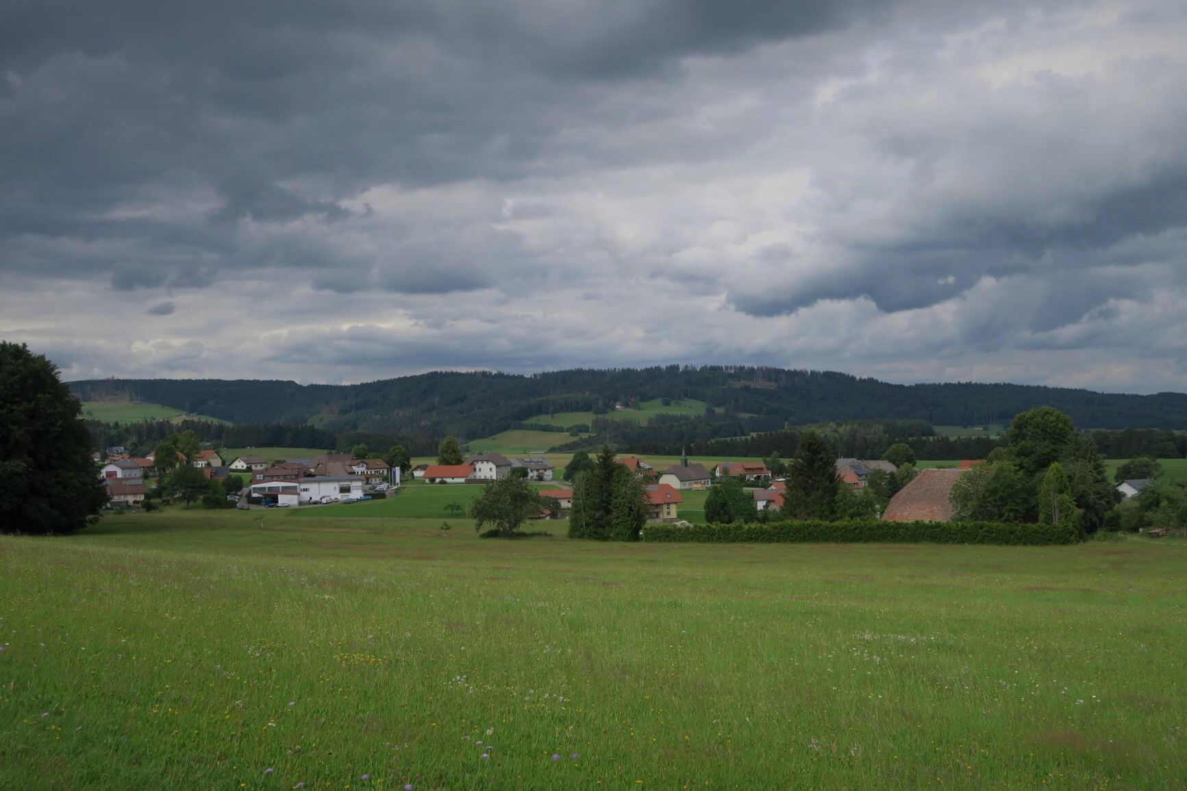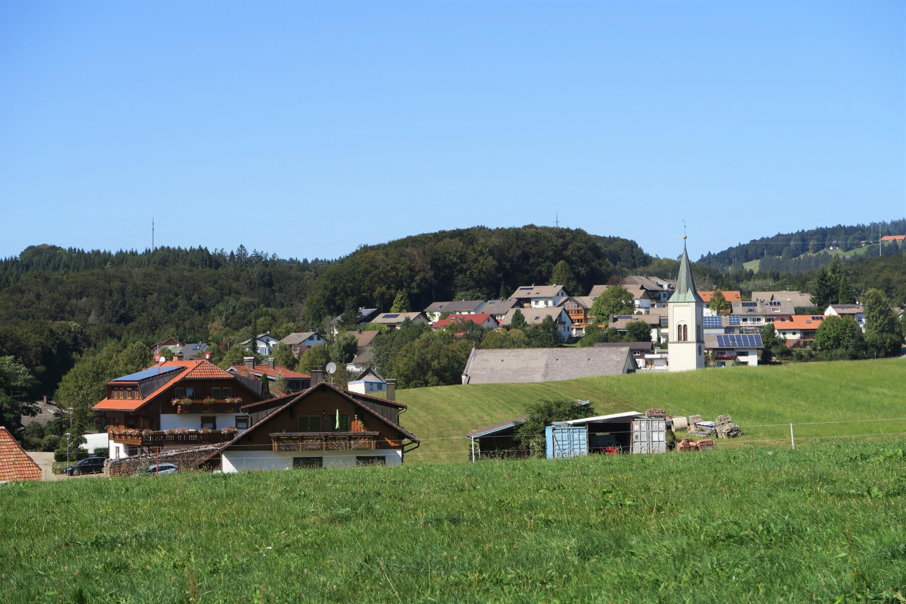 Hier verabschieden wir uns für eine Weile von der Rautenmarkierung und wandern entlang des Heidenwuhrs flussaufwärts. Spürbare Höhenunterschiede sind jedoch nicht verzeichnen. In kaum wahrnehmbarer Steigung schlendern wir an der Wuhre entlang weiter, ehe sich der Pfad nach knapp zwei Kilometern zu einer Schottertrasse weitet. Kurz darauf treffen wir den markierten Direktweg von Rickenbach und laufen gemeinsam mit diesem linker Hand hinauf zur K 6538, der wir links weiter sanft bergan folgen. In einer markanten Linkskurve der Kreisstraße bleiben wir geradeaus und wandern durch den Eggweg in die Ortsmitte von Hütten, 867m. Über den Klingenweg erreichen wir einen weiteren Wegweiser mit Namen Hütten, wo wir links aus dem Örtchen wieder hinaus wandern.