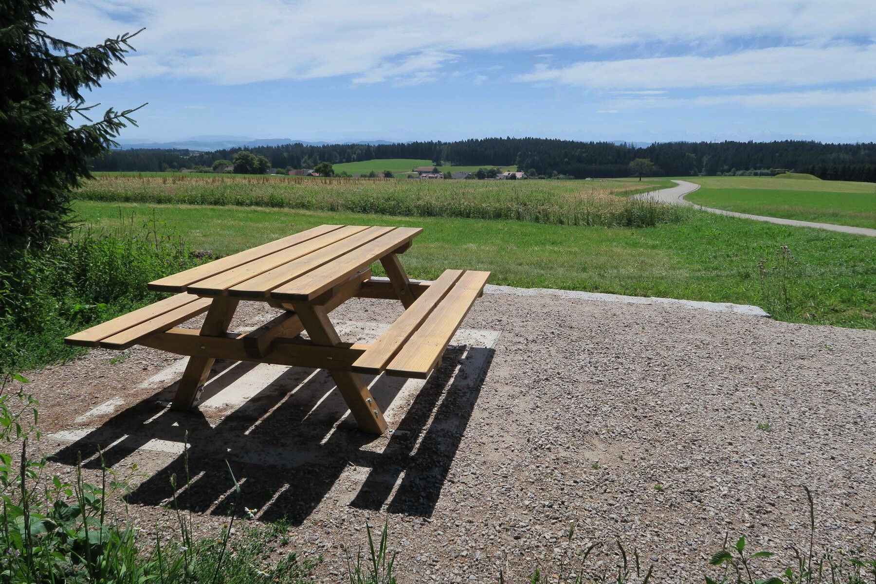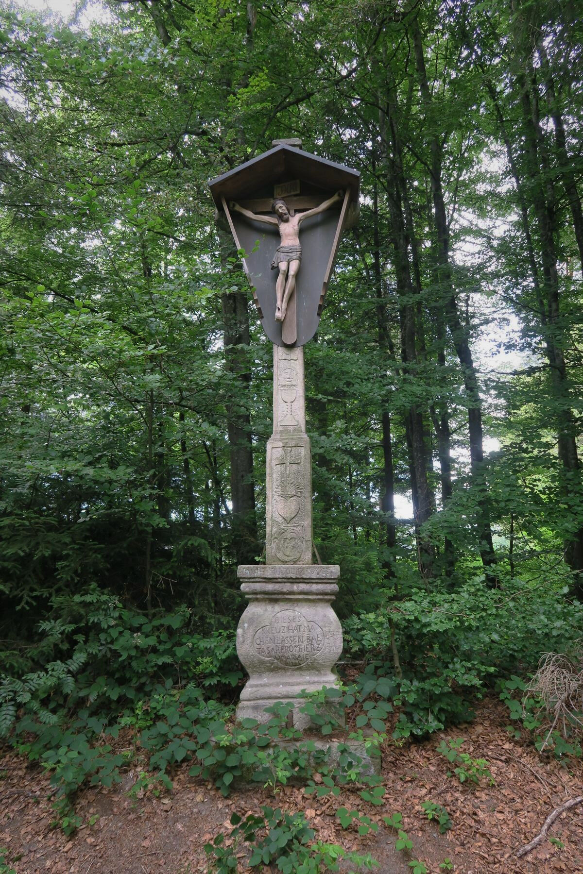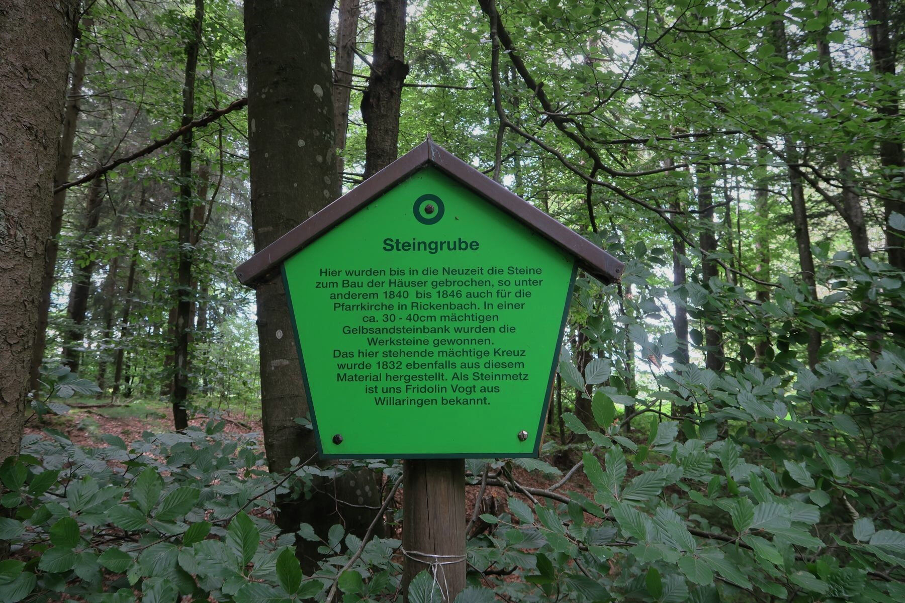 Wir biegen links ab und treffen bei einem Wasserbehälter auf einen Gedenkstein, der an die Salpetererunruhen im 18 Jh. erinnert. Kurz darauf passieren wir ein markantes Wegkreuz, biegen gleich danach rechts ab und treffen rasch die K 6539. Auf dieser vollzieht sich der nächste kurze Abstecher nach links zur am Waldrand gelegenen Panoramatafelmit Rastplatz. Sofern wir in den Genuss ungetrübter Alpensicht kommen lohnt sich hier eine gemütliche Pause. Danach geht es hinab nach Bergalingen, 820m und links haltend auf dem Kirchensteig weiter. Der folgende Abschnitt führt uns leicht rechts versetzt und dann in südöstlicher Richtung zum nächsten Pausenplatz am bekannten Heidenwuhr. Von hier sind es nur noch wenige Minuten in die Ortsmitte von Willaringen, 715m, wo wir erneut auf die gelbe Raute stoßen.
