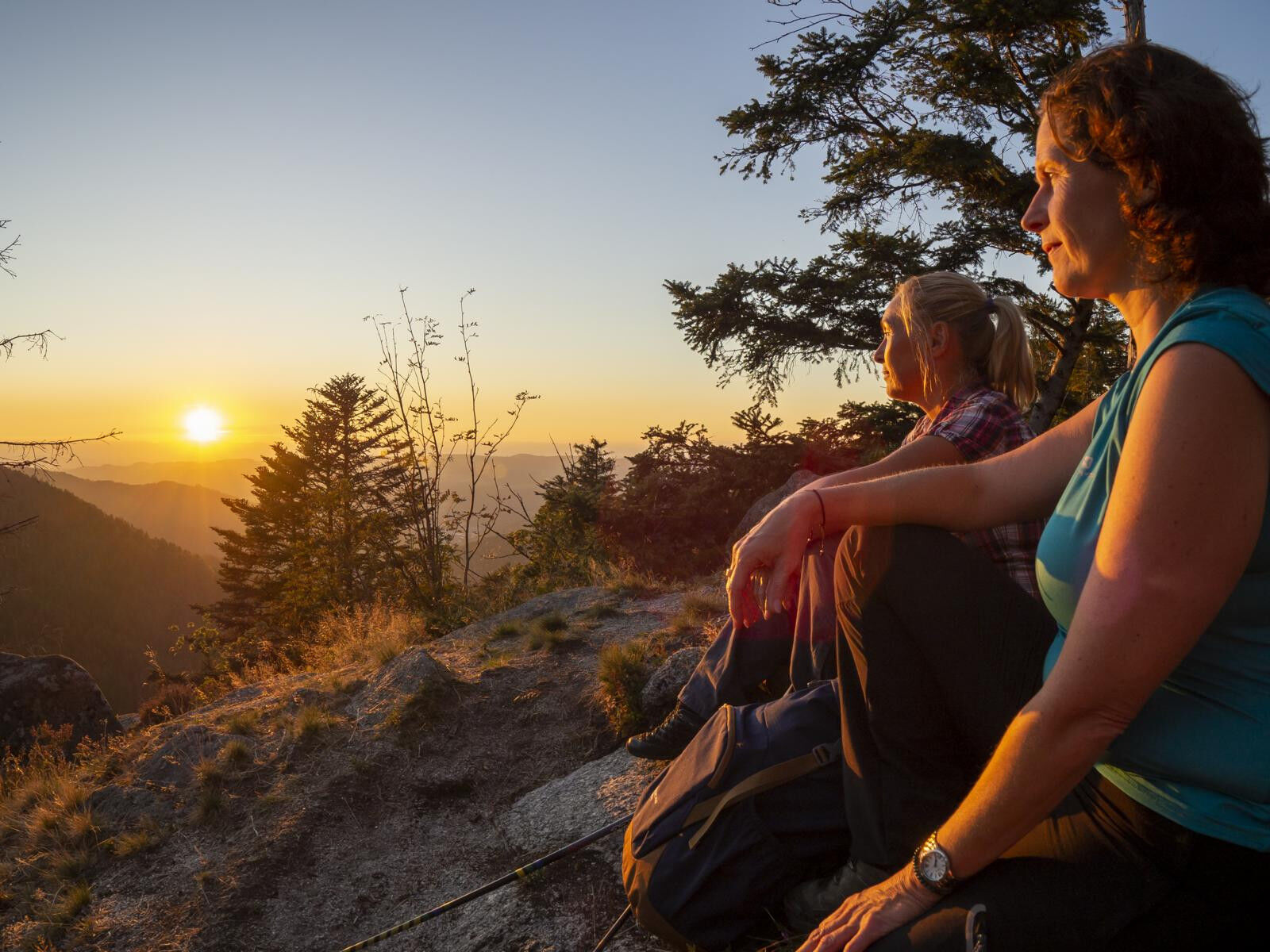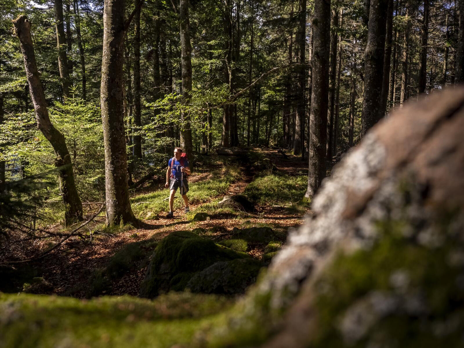 Kurze Zeit später verschluckt Dich der Wald auf dem Grat zwischen Hörnleberg und Rohrhardsberg. Unter den Bäumen versteckte Felsen und Aussichten am Tafelbühl und Braunhörnle, begleiten Dich entlang der Pfade zum Rohrhardsberg. Hier oben bläst ein rauer Wind. Zerzauste Tannen begrenzen die Bergwiesen, die sich nach Nordwesten öffnen und eine urige Landschaft freigeben. Wer genau hinschaut, entdeckt in den Wiesen und Wäldern große abgerundete Felsblöcke. Sie gelten als geheimnisvolle Zeugen der Geschichte, da ihr Ursprung abgeleitet werden kann auf die Rituale der Kelten oder aber auf Erosionen.
