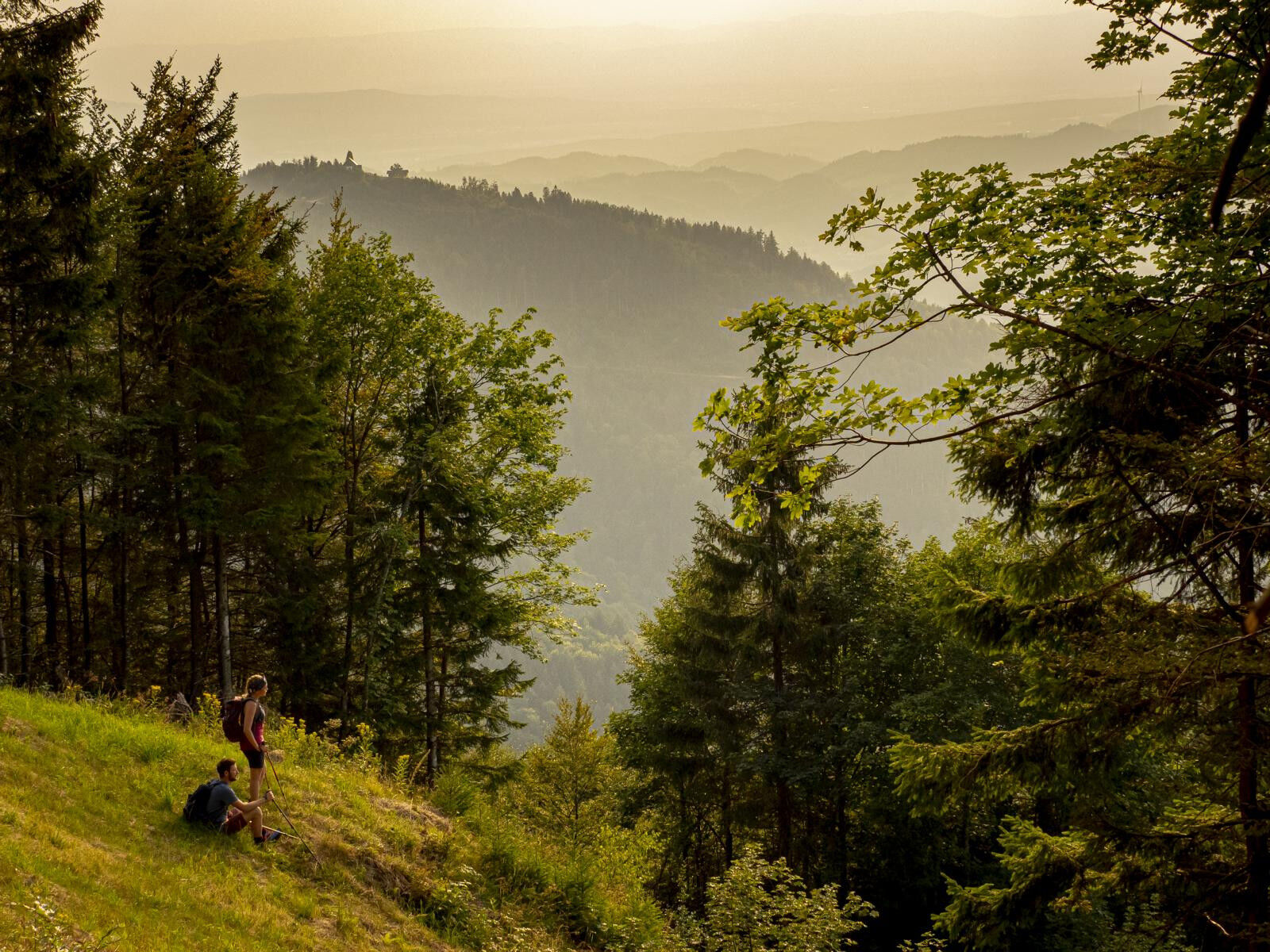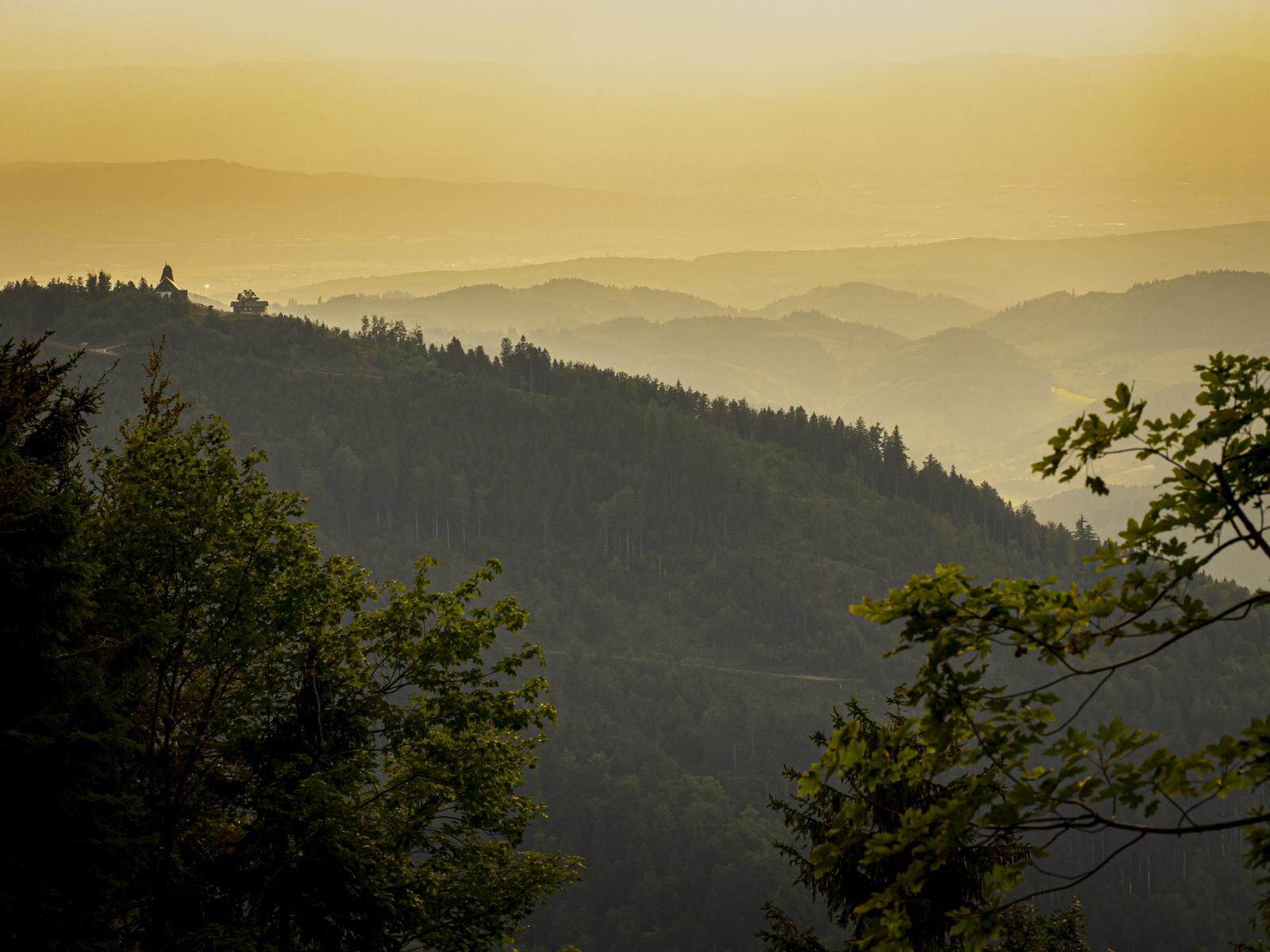 Bei der unscheinbaren Passhöhe Am Schlagbaum, deren Name daran erinnert, dass an dieser Stelle einmal ein wichtiger Grenzübergang zwischen Baden und Württemberg bestand, nimmt Dich der Wald wieder auf. Im Sommer verlocken die Beeren am Wegesrand zu Genießerpausen. Wie Fenster mit Aussicht liegen der Gfels und der Gschasifelsen am Weg. Bei der Kapfhütte verfliegt Deine aufkommende Erschöpfung schlagartig. Über die Elz und die gegenüberliegende Hügelkette hinweg schweift der Blick hinunter ins Kinzigtal, hinauf zum Brandenkopf und in die Ferne bis zur Hornisgrinde, dem höchsten Berg des Nordschwarzwaldes. Die Kinzig glitzert in der Sonne.