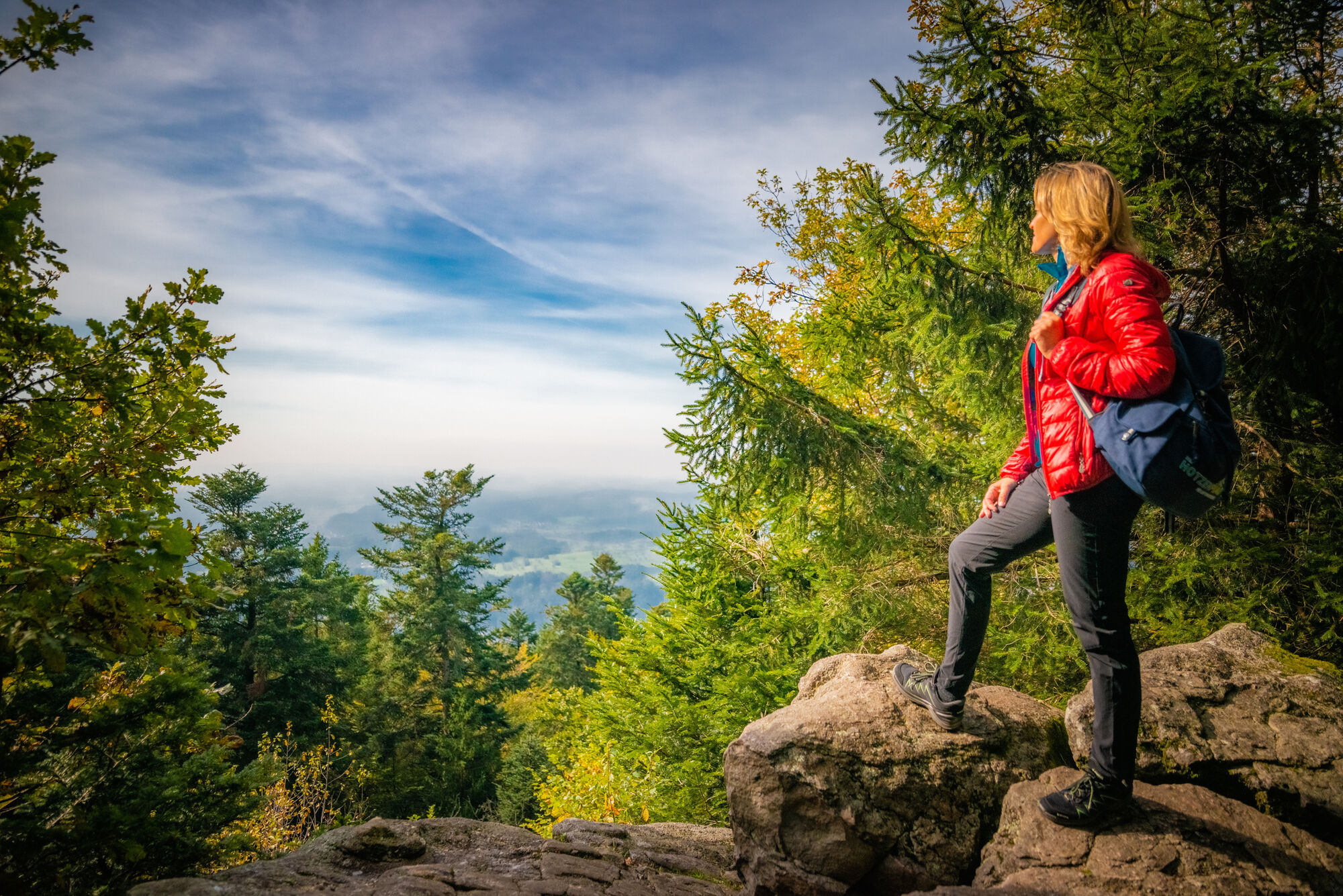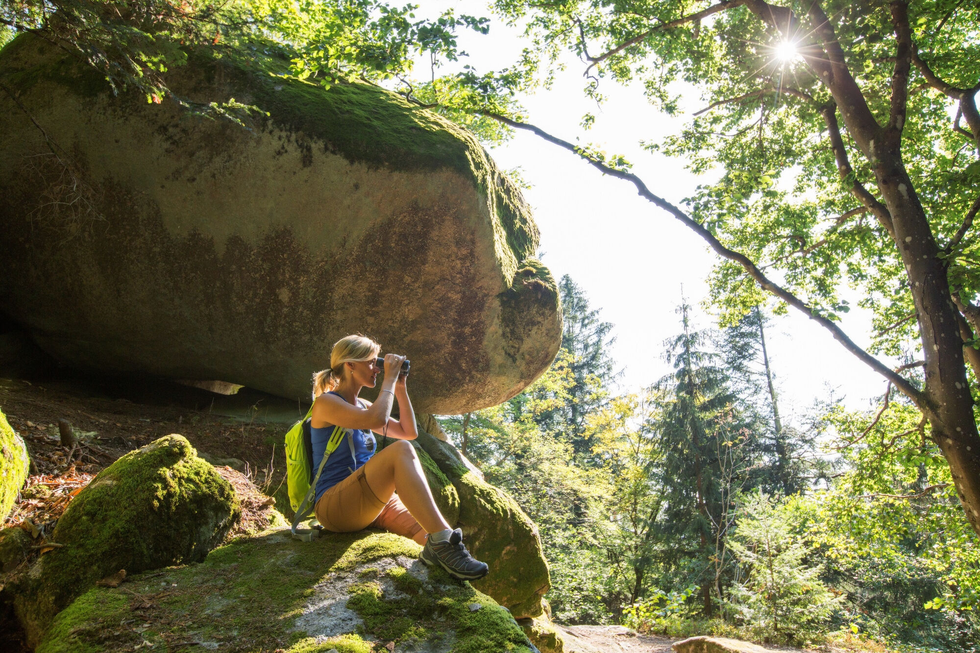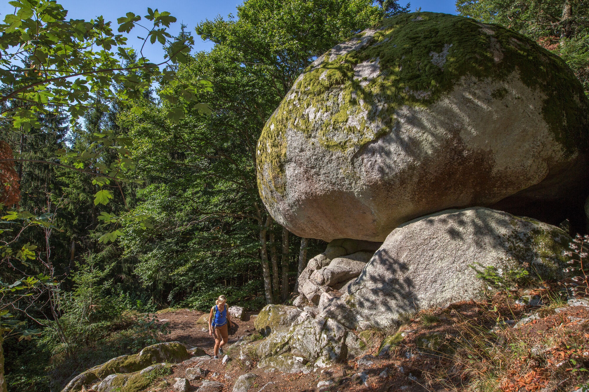 Hier biegen wir rechts ab und schlendern gemütlich zu den Häusern von Jungholzhinüber. Wo sich die Straße teilt, bleiben wir geradeaus, treffen bei einer Kreuzung auf den Hochrhein-Höhenweg und wenige Meter weiter auf den bekannten Hotzenpfad. Beide Wanderwege schicken uns zum Naturdenkmal Solfelsen, einer mächtigen Granitformation mit angeschlossenem Pausenplatz. Ein kurzer Anstieg bringt uns danach vom nahen Spatzenhofzum Wanderparkplatz am Solfelsen, der auch Ausgangspunkt vom Hotzenpfad ist (alternativer Ausgangspunkt).