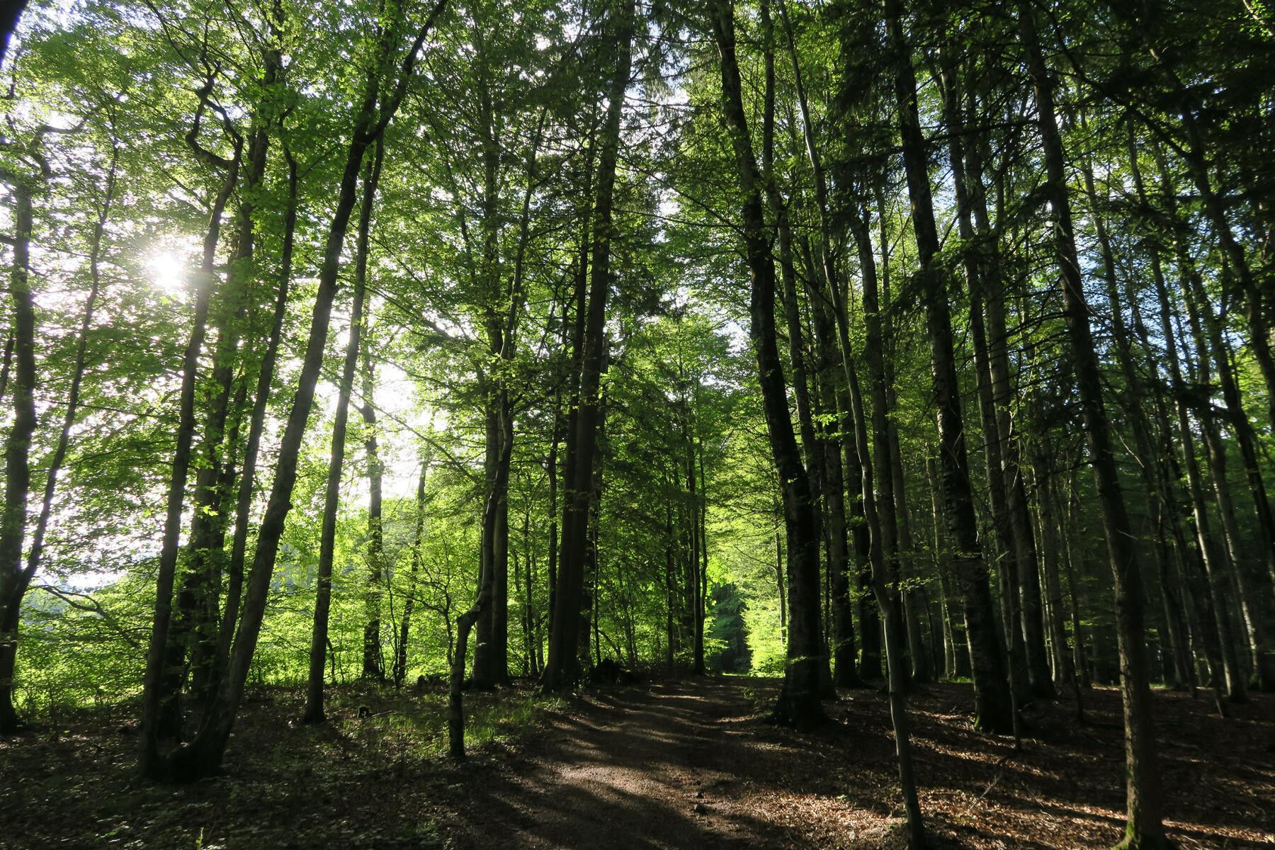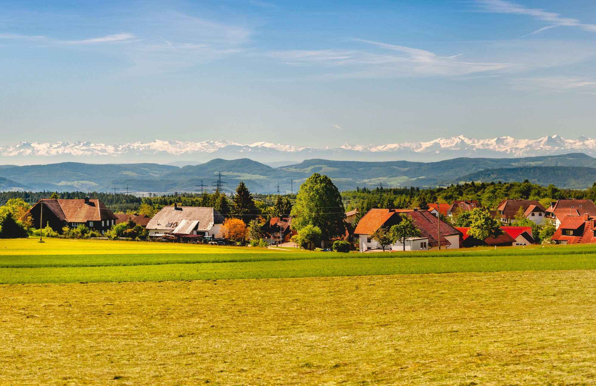 Nun wandern wir auf dem Genießerpfad zur Straße (L155), dort kurz rechts parallel zur Fahrbahn und biegen dann links auf einen Grasweg zum Dekalogplatzein. Hier lohnt ein kurzes Innehalten, und mit etwas Glück können wir auch eine erhabene Sicht zur Schweizer Alpenkette genießen. Dem Hotzenpfad bleiben wir noch eine Weile treu, queren eine Talsenke, passieren den Wegpunkt Einschlagsowie kurz darauf den Salpetererstein, einen Gedenkstein. Nach einer weiteren Passage entlang der Fahrbahn erreichen wir das Alpenpanorama oberhalb von Bergalingen. Hier gehen wir am Waldrand entlang bis zur Ecke des Waldstücks, wo der Hotzenpfad links abwinkelt. Für uns geht es jedoch rechter Hand auf breiter Trasse zu einem Wirtschaftsweg, auf diesem nach links und mit der gelben Raute zu jenem Punkt, wo das Heidenwuhrkreuzt. Geradeaus senkt sich der Weg steil zum Abzweig Seelmattzurück, von wo wir auf dem Hinweg wieder nach Rickenbach gelangen.