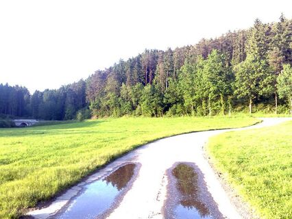Von dort folgt eine lange Abfahrt und mehrere Kilometer auf Asphalt. Schließlich überquert man hinter dem Schlatzendorfer Wald die B 85 und kehrt auf dem Regentalradweg zurück zum Ausgangs-punkt in Fernsdorf.
