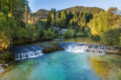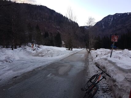 Von Bled fahren Sie nach Rečica und weiter zum Dorf Poljšica. Über Poljšica führt die Straße unter dem berühmten geologischen und geschichtlichen Erbe, der Poglejska cerkev Höhle. Fahren Sie weiter bis Krnica über Gorje, wo Sie an der Hauptstraße nach links abbiegen. Nach einigen Metern folgen Sie dem Wegweiser für Radovna. Fahren Sie von der Straße nach rechts bergab und durch das Dorf bergab bis zu der Brücke. Wenn Sie die Brücke über Radovna überqueren, biegen Sie nach links in das Tal. Fahren Sie auf der Straße bis zur Abzweigung einer weiten Schotterstraße, die sich von der linken Seite an die Hauptstraße, auf der Sie fahren, anschließt. Hier schließen Sie sich der Trasse Juliana Bike an.