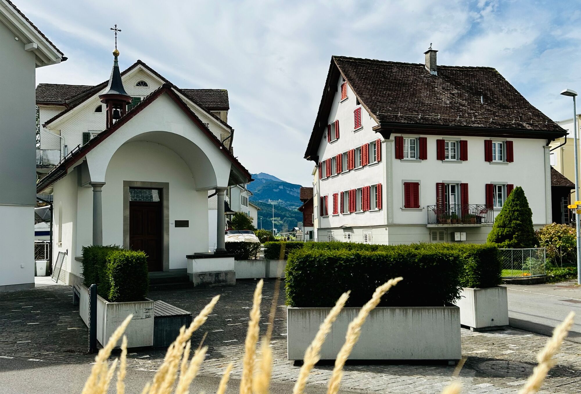Nach dieser Kapelle folgt ein kurzer Anstieg nach Unterschönenbuch, einem Weiler mit 150 Einwohnenden. Die Häuser des Weilers formieren sich locker um die prächtige St. Wendelinkapelle. Dieser Sakralbau wurde zu Beginn des frühen 18. Jahrhunderts fertiggestellt und ist nach dem Schutzpatron der Landwirte benannt. Weiter geht es entlang der Strasse nach Oberschönenbuch. Mit etwas Glück können sich sonnende Mauereidechsen beobachtet werden. Wer es ihnen gleichtun möchte, fi ndet am Strassenrand eine weitere Sitzbank. Durch die gewonnenen Höhenmeter geniesst man einen grossartigen Ausblick auf die Muota-Ebene in Richtung Urmiberg. Es folgt ein erneuter, aber sanfter Geländeanstieg auf der Unterschönenbuchstrasse mit direktem Blick auf die Mythen. Farbige Wiesen und Weiden mit vereinzelten Hecken und Obstbäumen sowie rustikale Bauernhäuser prägen die Landschaftskammer.