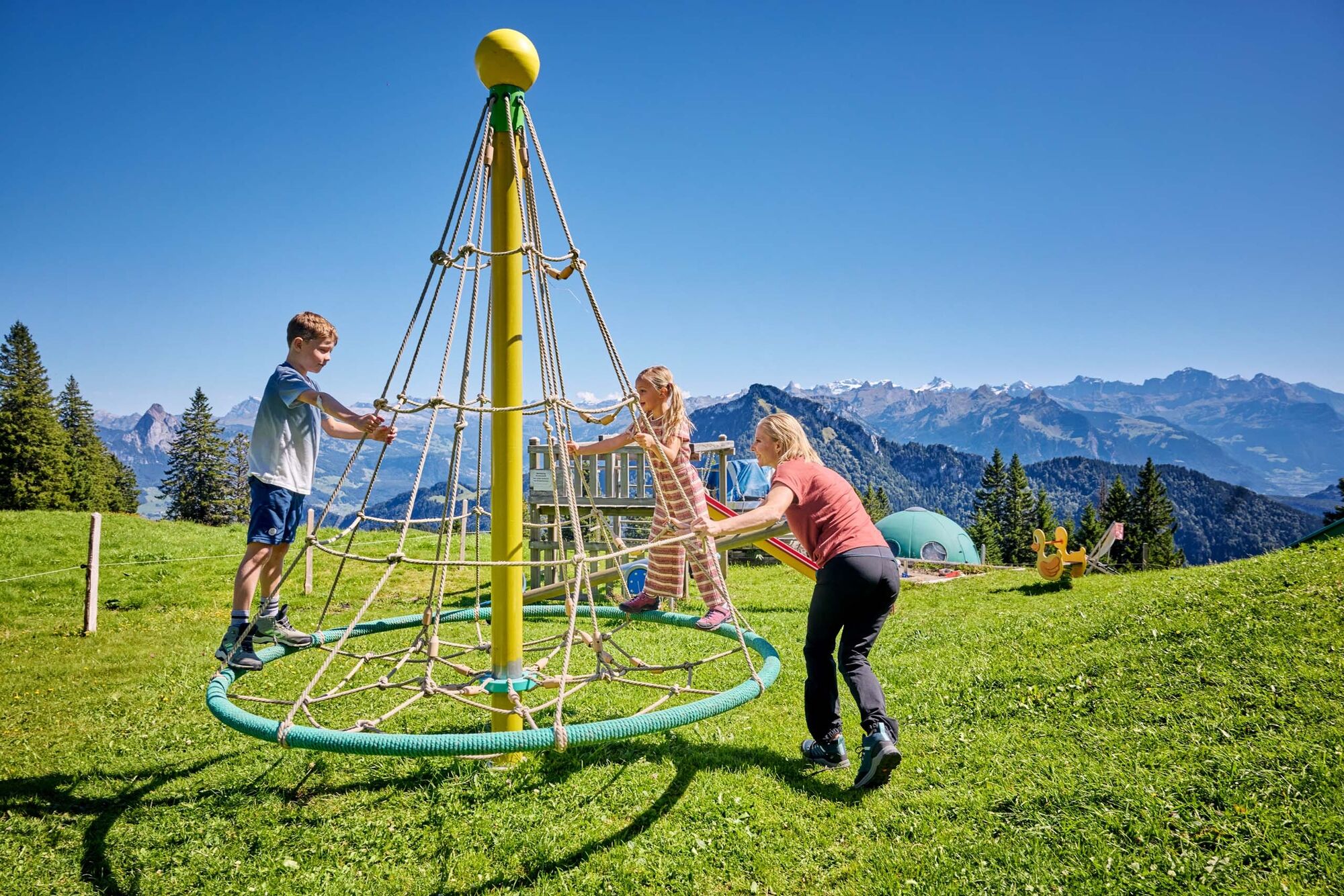 Mit der Luftseilbahn Obergschwend – Rigi Burggeist gelangen Sie bequem zum Ausgangspunkt der Wanderung. Ein Zwischenhalt bei den beiden Spielplätzen bei den Gasthäusern Rigi Scheidegg und Rigi Burggeist lohnt sich auf jeden Fall.