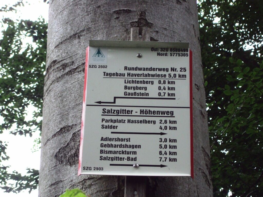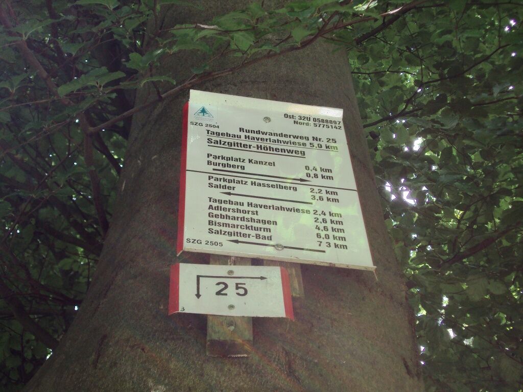 Vom Parkplatz geht man am nördlichen Ende (also quasi gegenüber der Aussichtskanzel) rechts in den Wald. Die ausgeschilderten Wanderwege 25 und 26 laufen zunächst 200 m nach Osten auf einem befestigten Waldweg durch hohen Buchenwald. An einer Weggabelung geht der Weg 25 links ab auf einem Trampelpfad weiter bis zu einem Forstweg am Waldrand. Diesem folgt man links und wird danach zweimal rechts geleitet. Wer mag, kann an dieser Stelle einige Meter auf den Weg 24 abweichen, bis man rechter Hand einen kleinen Ratsplatz mit einer Geopark-Informationstafel findet. Hier ist je nach Belaubungszustand der Bäume ein Ausblick auf Salzgitter-Lichtenberg möglich. Man geht auf dem eigentlichen Forstweg noch 100 m ostwärts, bevor man rechts durch hohen Laubwald bis zum Gipshüttenweg wandert. Nach 1,8 km biegt man rechts ab und gelangt auf einen asphaltierten Weg. Er führt nach rechts und dann immer geradeaus. Es geht am ehemaligen Tagebau Haverlahwiese vorbei, den man selbst aber nicht sieht. Man kann allerdings den Schildern folgend einen Abstecher machen (0,8 km eine Richtung), und auf die renaturierte Fläche schauen (u.a. Kammolchbiotop). Der eigentliche Weg führt allerdings immer geradeaus zurück zum westlichen Waldrand. Dort verläuft der Rundkurs als Feldweg 450 m nordwärts bis zum Kalkrosenberg. Hier geht es nach links auf stellenweise aufgeweichtem Weg bis zu dem ehemaligen Vorwerk Altenhagen. Der Weg zum Ausgangspunkt am Parkplatz zurück führt in einer Spitzkehre erst rechts auf schwierigem (im Sommer 2021 zugewachsenem) Waldarbeiterweg und nach 300 m links parallel zum Weg 26 über einen befestigten Waldweg bergauf um den Kalkrosenberg. Alterntiv zum zugewachsenen Schlussanstieg kann man dem Weg am Vorwerk Altenhagen weiterfolgen. Man kommt so am BUND Waldhaus vorbei zur Straße. An ihr entlang führt rechtsseitig ein gut nutzbarer Trampelpfad zurück zum Parkplatz.