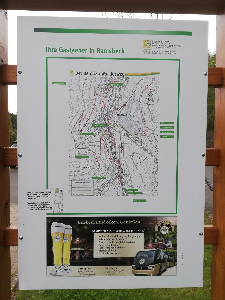 Der Wanderweg beginnt am Bergbaumuseum und er umfasst als Gesamtstrecke ca. 10 km. Zahlreiche Bänke und Tische laden zur Rast ein. Sie können auch drei Teilstrecken gehen (siehe Karte). Alle Strecken führen durch den Ortsmittelpunkt von Ramsbeck. Im Bereich Werdern gibt es zwei Streckenteile, die eine Ergänzung bieten. Den Weg bei den Halden Aufbereitung (Willibald) können wir erst später offiziell ausweisen. Der Grund ist, dass noch Arbeiten des ehemaligen Grubenbetreibers durchgeführt werden.