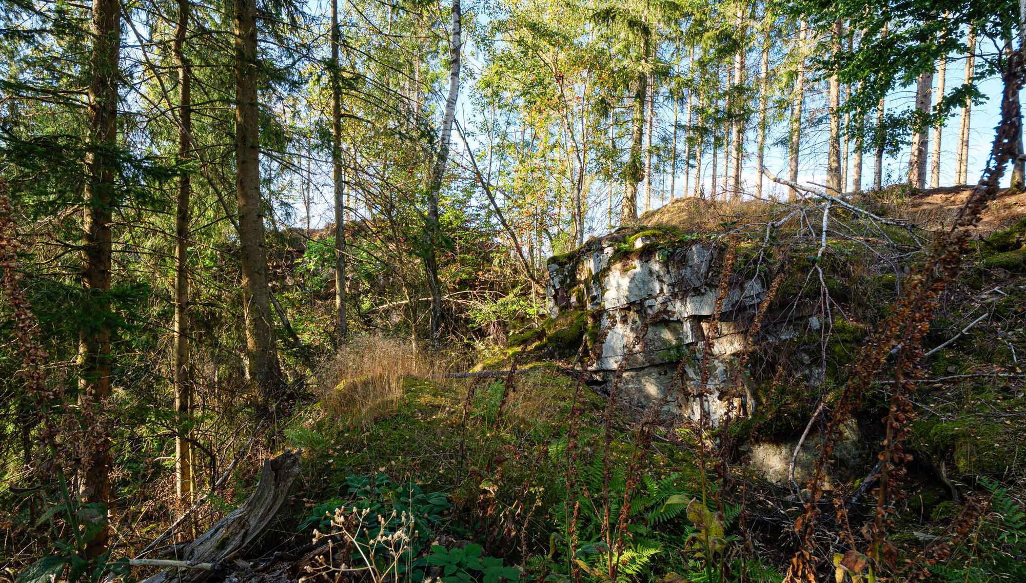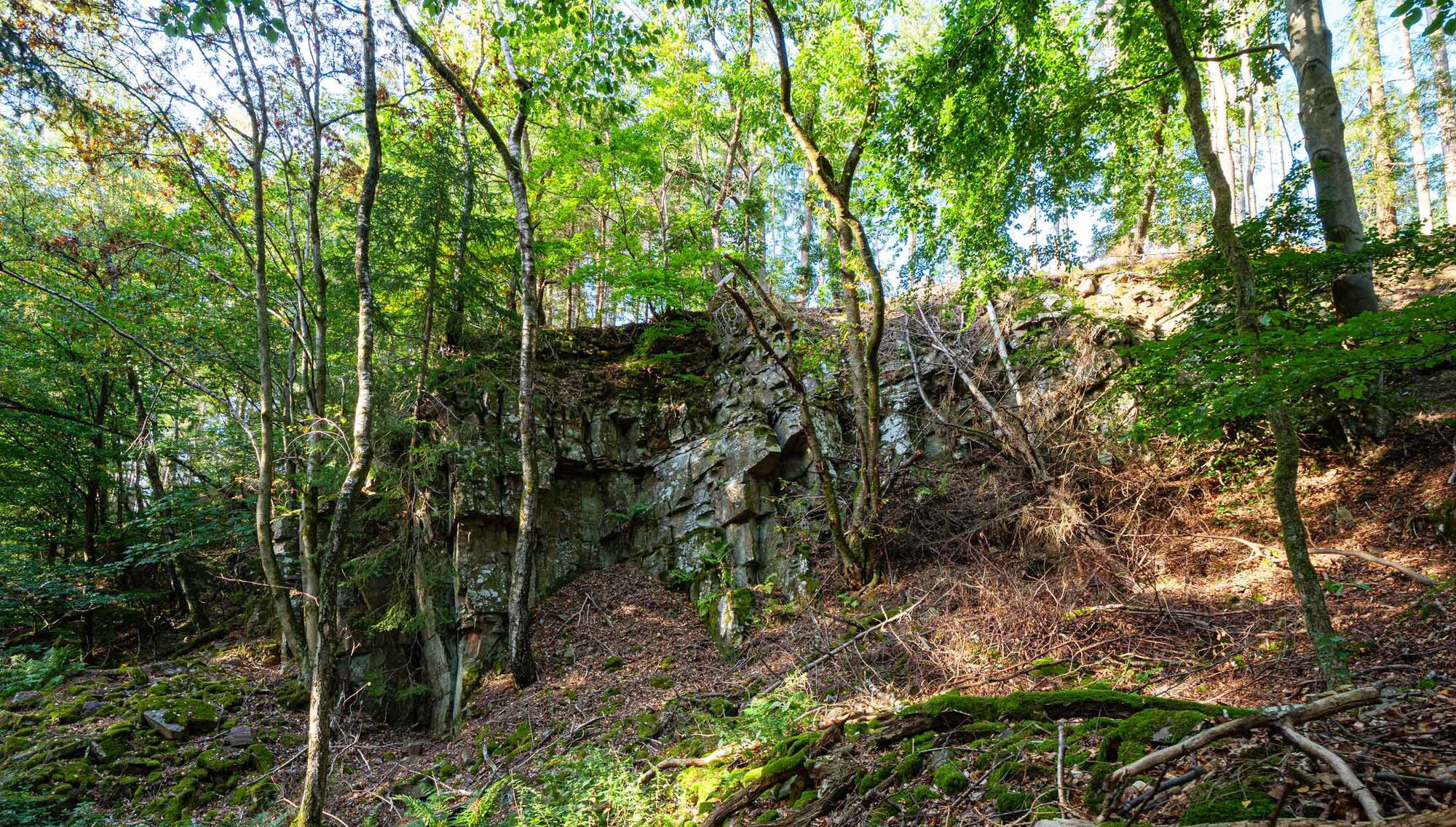 Vom „Wegweiser Wilzenbergturm“ aus folgen wir der Markierung O4 bis wir wieder auf die Kreuzung Stellmecke stoßen. Ab hier geht es mit dem gleichen Weg wieder runter bis nach Winkhausen und der X27 bis hinter das Hotel Deimann. An den Teichen im Hotelgarten folgen wir der Rothaarsteig-Spur (weißes liegendes R auf schwarzem Grund) bergauf in Richtung „Deimanns Hütte“ und „Knollen-Steinbruch“. Hinter der Hütte führt uns der Weg bergan durch den „Knollen-Steinbruch“ bis zur Schutzhütte „Weißes Kreuz“.