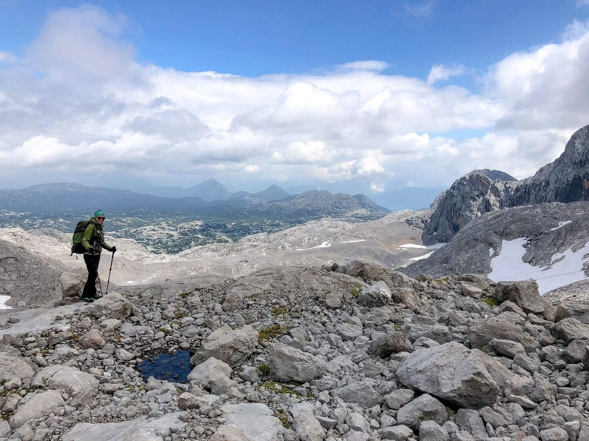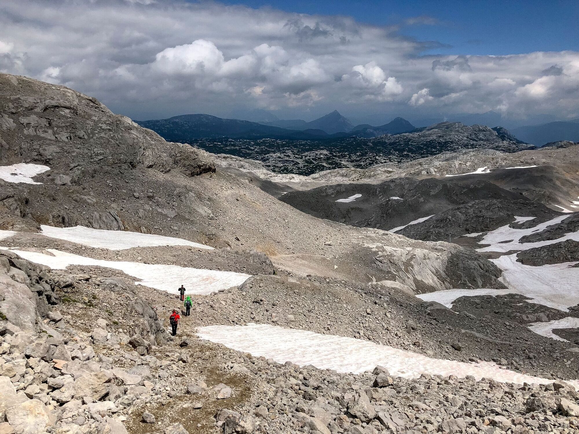 Durch zwei imposante Landschaften, die unterschiedlicher nicht sein können, führt uns diese Tour. Zunächst geht es über den Schladminger Gletscher mit Blick auf die weiten Flächen und Rücken der Landschaft "Am Stein", ein etwa 20 km² großes Karstgebiet, das auf den ersten Blick aus knochentrockenen Felskuppen und öden Gruben mit ein paar Grasoasen und Latschen besteht. Entlang des Weges sind wahrlich dann auch versteinerte Dachsteinmuscheln und Dolinenschlünde unsere Wegbegleiter. Doch, wie so oft, bringt ein genauerer Blick auf diese im ersten Moment als Steinwüste erscheinende Landschaft Erstaunliches an den Tag. Zwischen den messerscharfen Karrenfelsen und Dolinen erwacht Jahr für Jahr, kaum ist der Schnee geschmolzen, eine unglaubliche Pflanzenwelt: Almrausch und Enzian, Kohlröschen und Anemonen sorgen hier am Dachstein für üppige Blütenteppiche.
