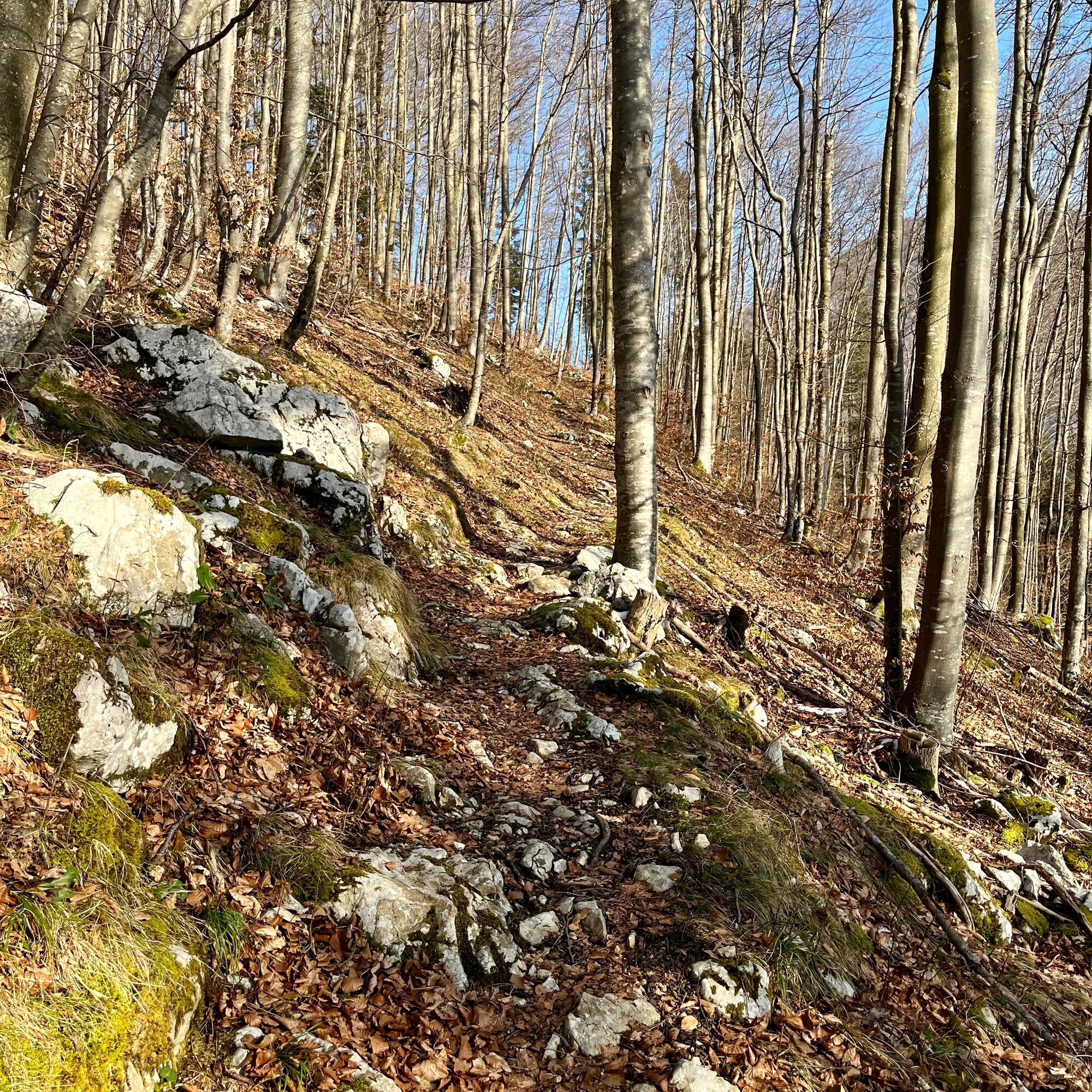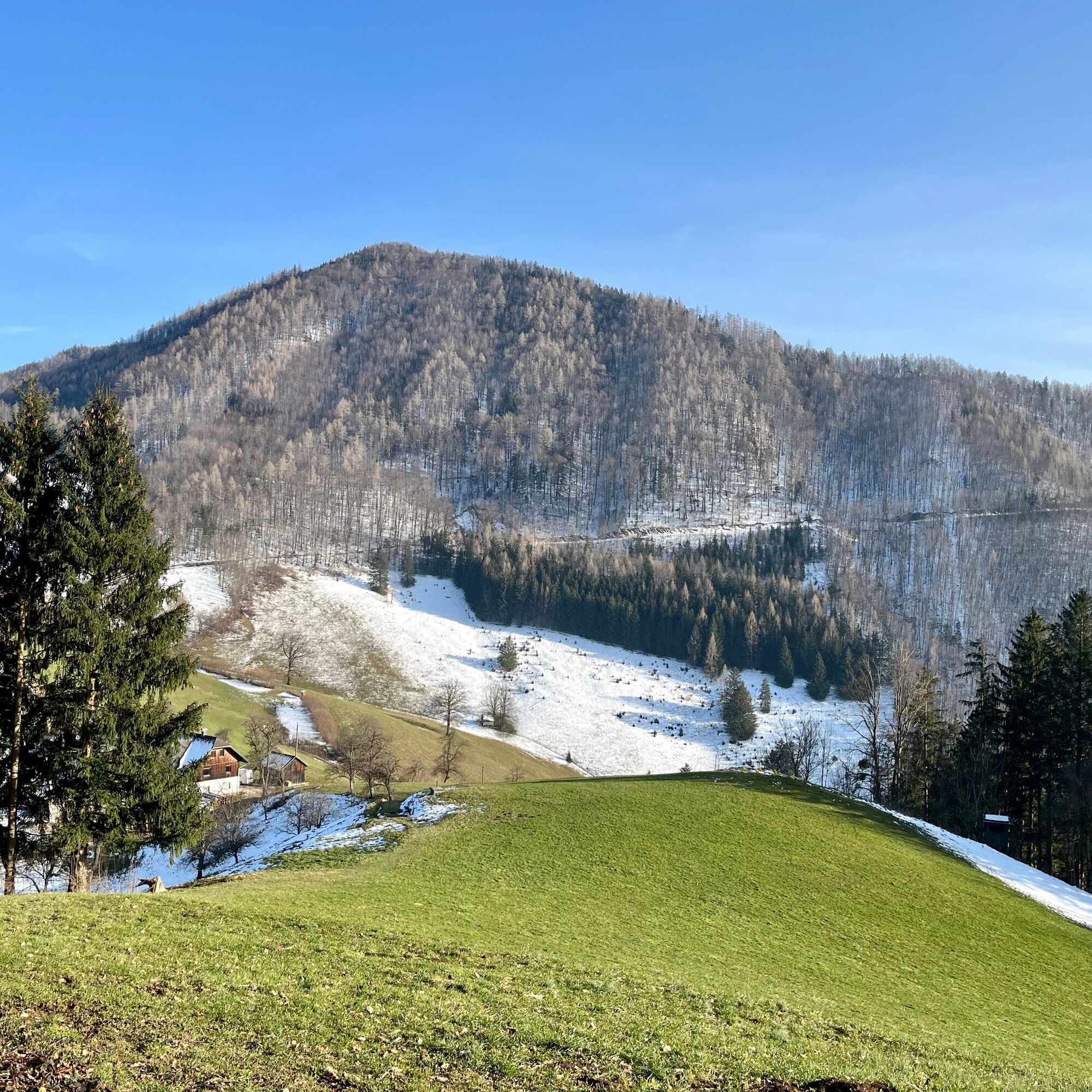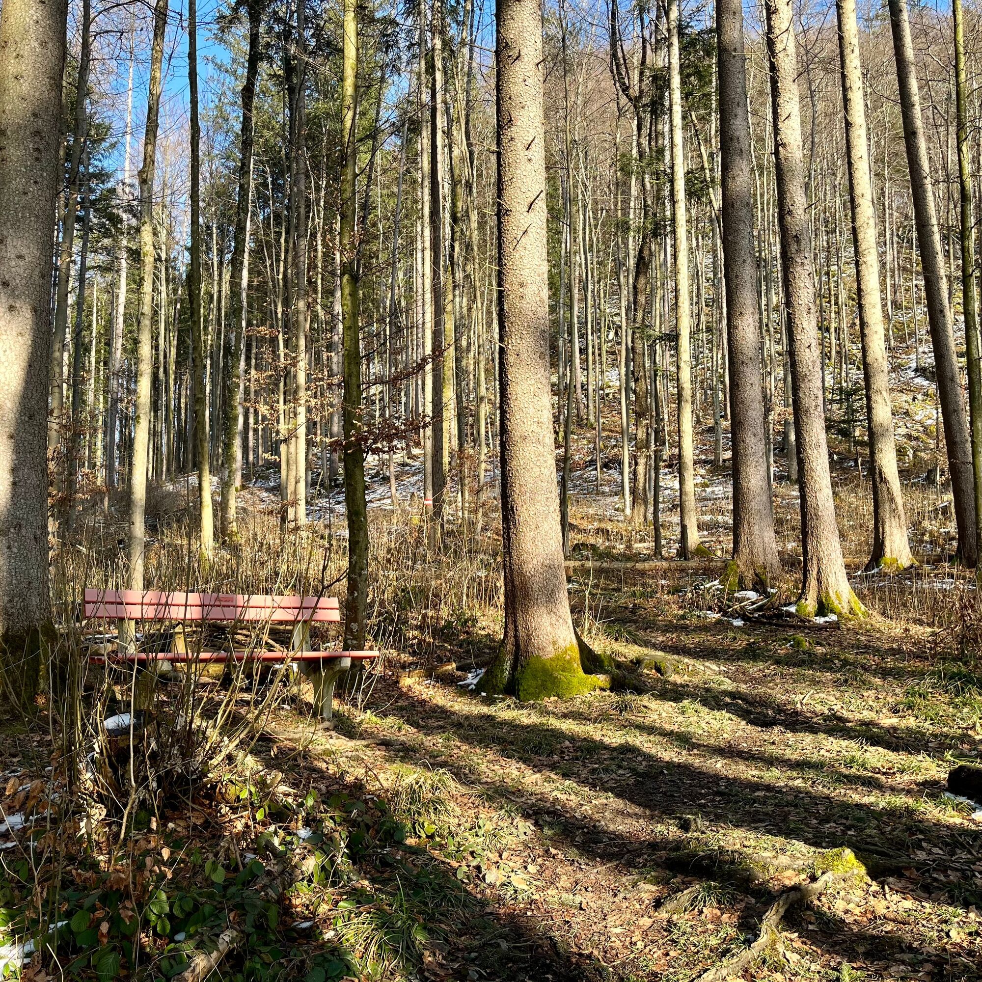 Nachdem man der Wiese bis zu einem Bauernhof bergab gefolgt ist, folgt man nun der gut ausgebauten Straße bis zum Bauernhof “Denk” direkt nach dem letzten Gebäude biegt man links zum Haus und anschließend gleich wieder auf einen Wiesenweg. Dieser ist jedoch schlecht sichtbar und das Ziel nicht beschildert. Man erreicht jedoch den Waldweg, wenn man sich links hält. Nun dem Waldweg bergauf folgen der über einen kleinen Hügel führt. Am Ende des Weges steigt man gleich wieder in den gegenüberliegenden Trail ein der nun auf gut ausgetretenen Waldwegen bergab führt. Auch hier ist es wieder wichtig sich links zu halten da es 2 Weggabelungen gibt und die Strecke nur selten beschildert ist. Immer wieder laden Bänke entlang der Wege zum Verweilen ein. Der Rest des Weges verläuft auf einem Waldweg der uns wieder bis zur Straße bringt. Dieser folgt man dann wieder zurück bis in den Ortskern und zur Bushaltestelle.