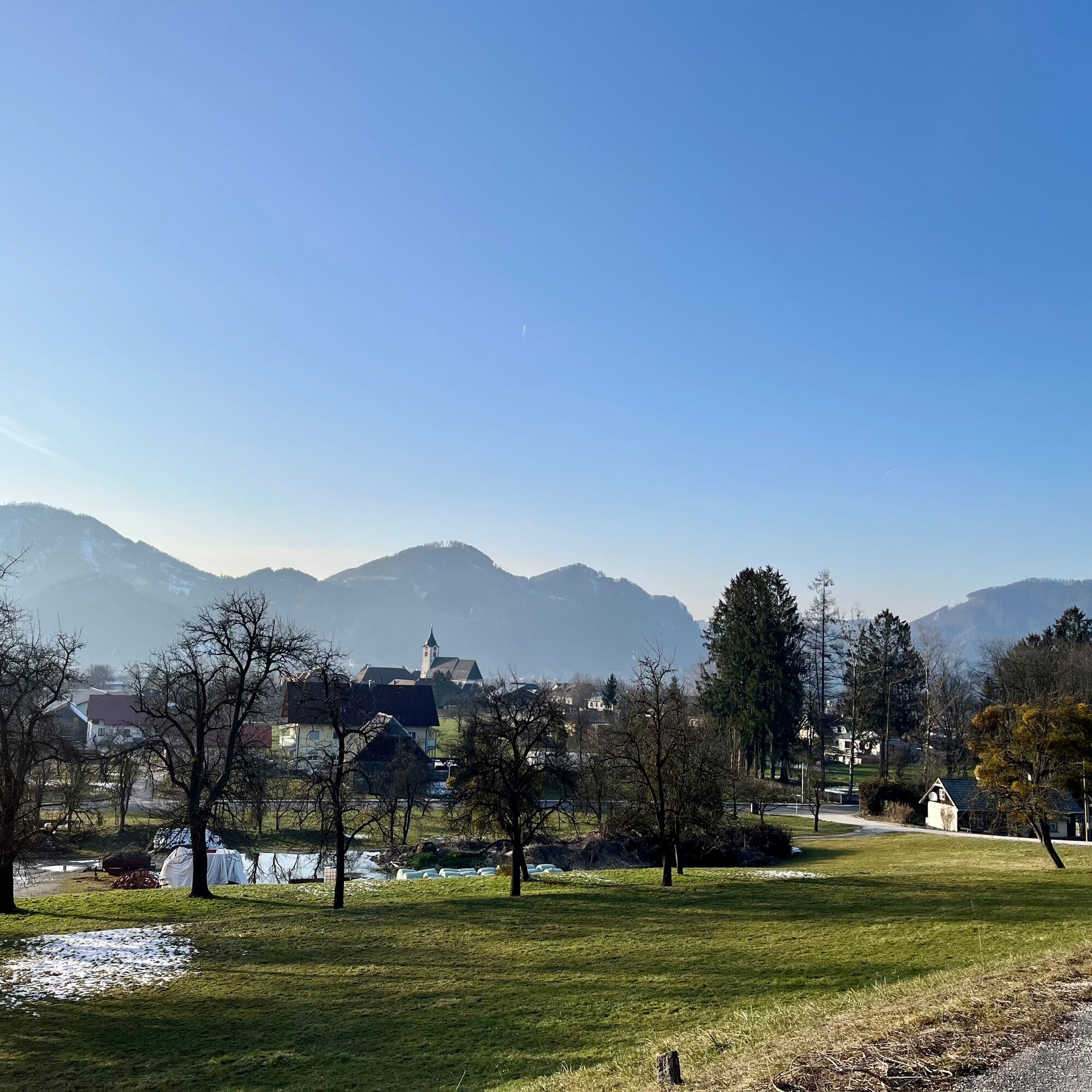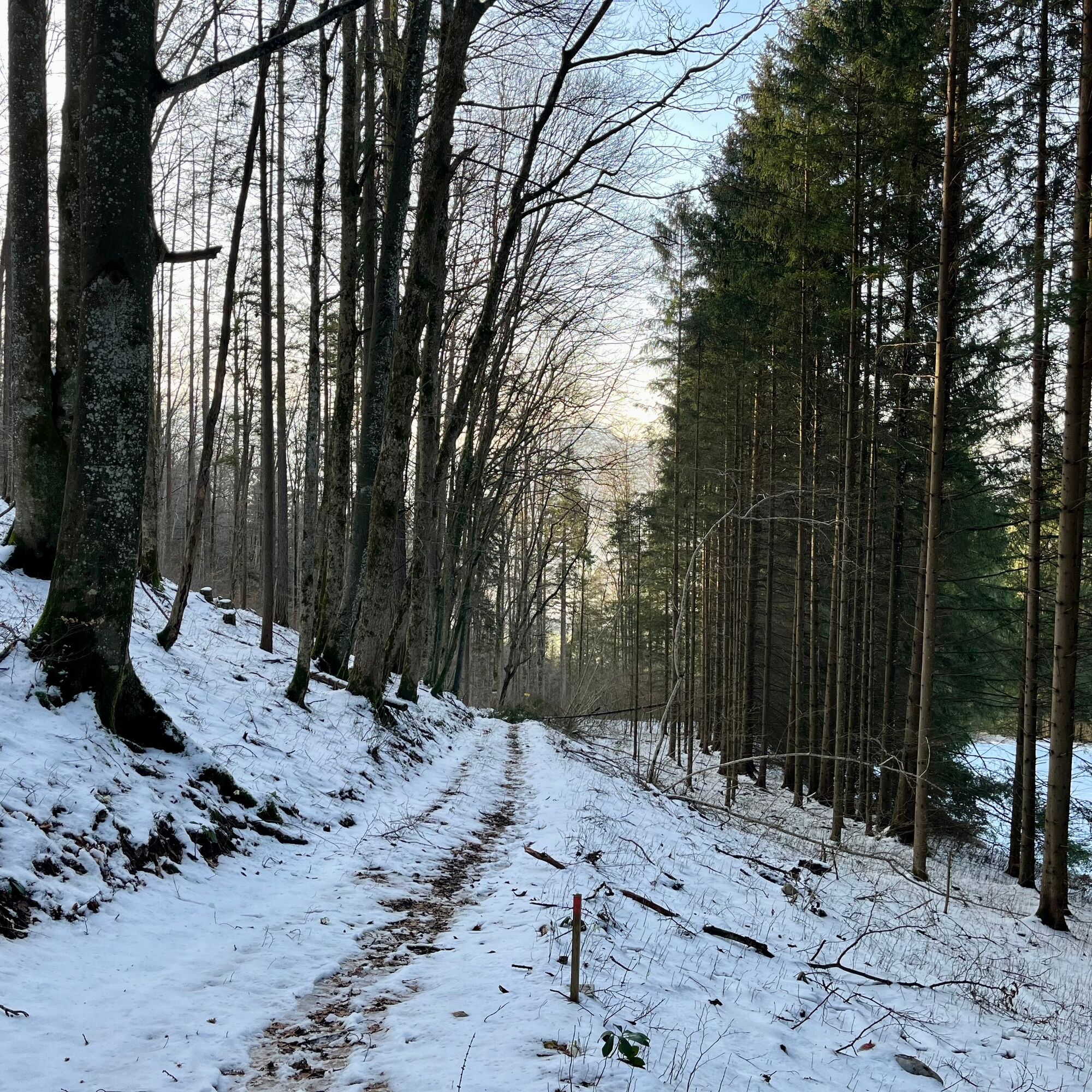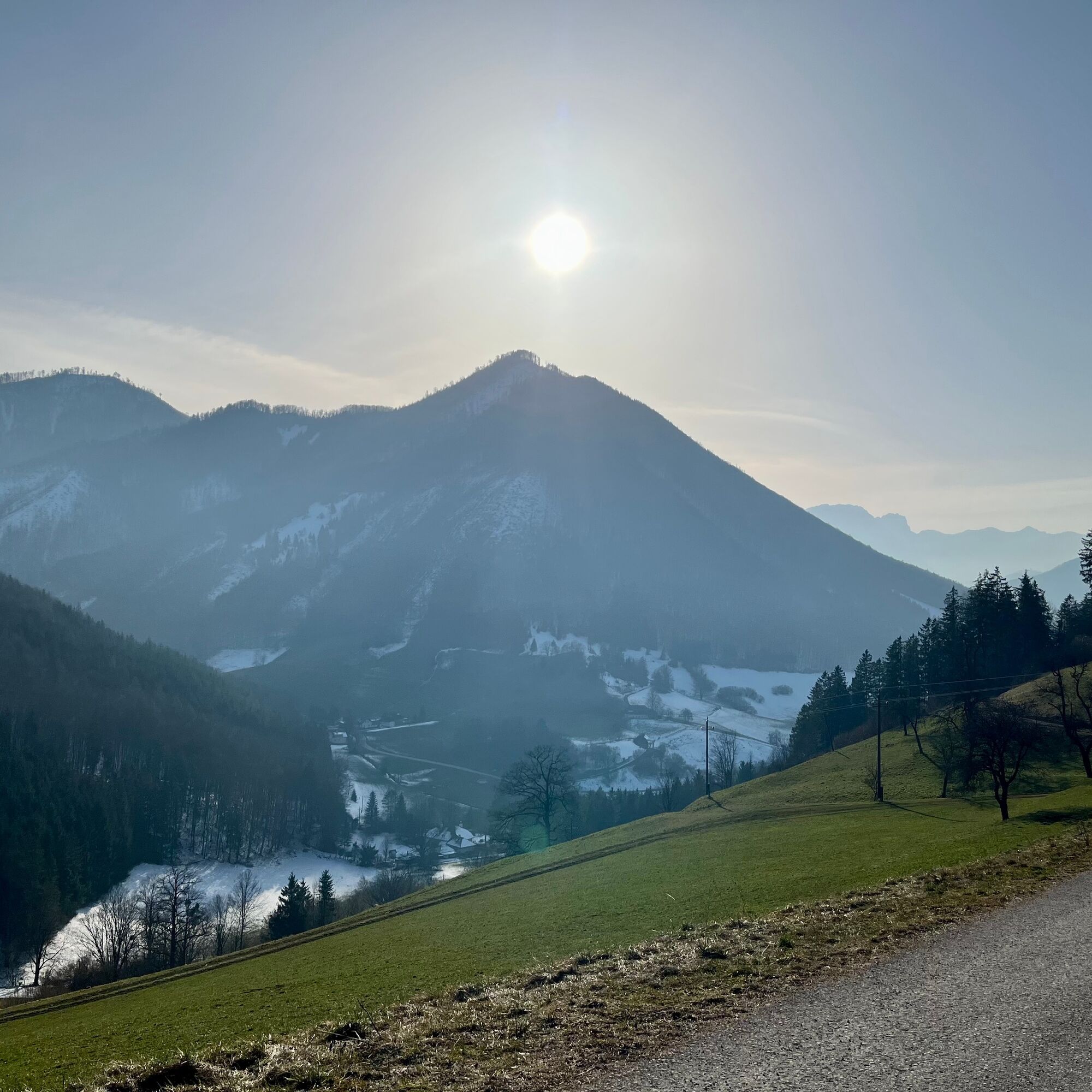 Nachdem man der Wiese bis zu einem Bauernhof bergab gefolgt ist, folgt man nun der gut ausgebauten Straße bis zum Bauernhof “Denk” direkt nach dem letzten Gebäude biegt man links zum Haus und anschließend gleich wieder auf einen Wiesenweg. Dieser ist jedoch schlecht sichtbar und das Ziel nicht beschildert. Man erreicht jedoch den Waldweg, wenn man sich links hält. Nun dem Waldweg bergauf folgen der über einen kleinen Hügel führt. Am Ende des Weges steigt man gleich wieder in den gegenüberliegenden Trail ein der nun auf gut ausgetretenen Waldwegen bergab führt. Auch hier ist es wieder wichtig sich links zu halten da es 2 Weggabelungen gibt und die Strecke nur selten beschildert ist. Immer wieder laden Bänke entlang der Wege zum Verweilen ein. Der Rest des Weges verläuft auf einem Waldweg der uns wieder bis zur Straße bringt. Dieser folgt man dann wieder zurück bis in den Ortskern und zur Bushaltestelle.
