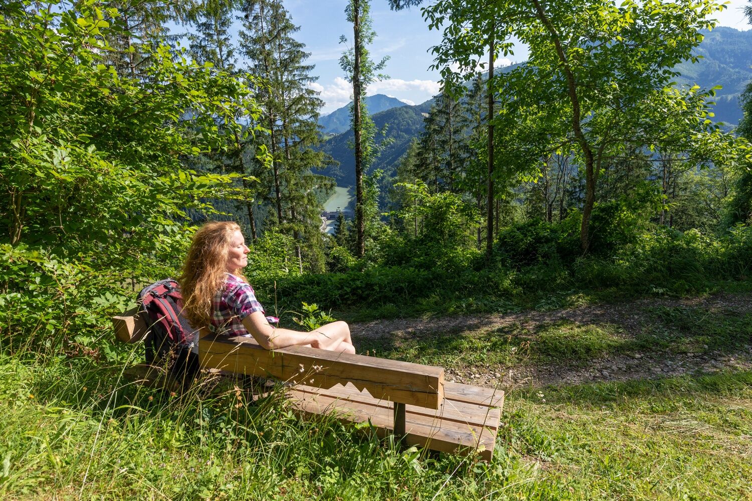 Vom Parkplatz auf der Bahnpromenade führt die Wanderung entlang des Gaflenzbachs 1,5 km bachabwärts. Von rechts mündet der Gasselgraben mit dem markierten Wanderweg zu den Rotmäuern. Der markierte Wanderweg führt im engen Gasselgraben einen halben Kilometer aufwärts bis die Markierung links hinaus auf die freien Wiesen (Kochlöffel-Au-Seberlbauer) ableitet. Bis hierher kann man auch mit dem Auto hochfahren. Jetzt zweigt links ein schöner Wanderweg ab und führt bei guter Aussicht schräg links aufwärts zur Bank.