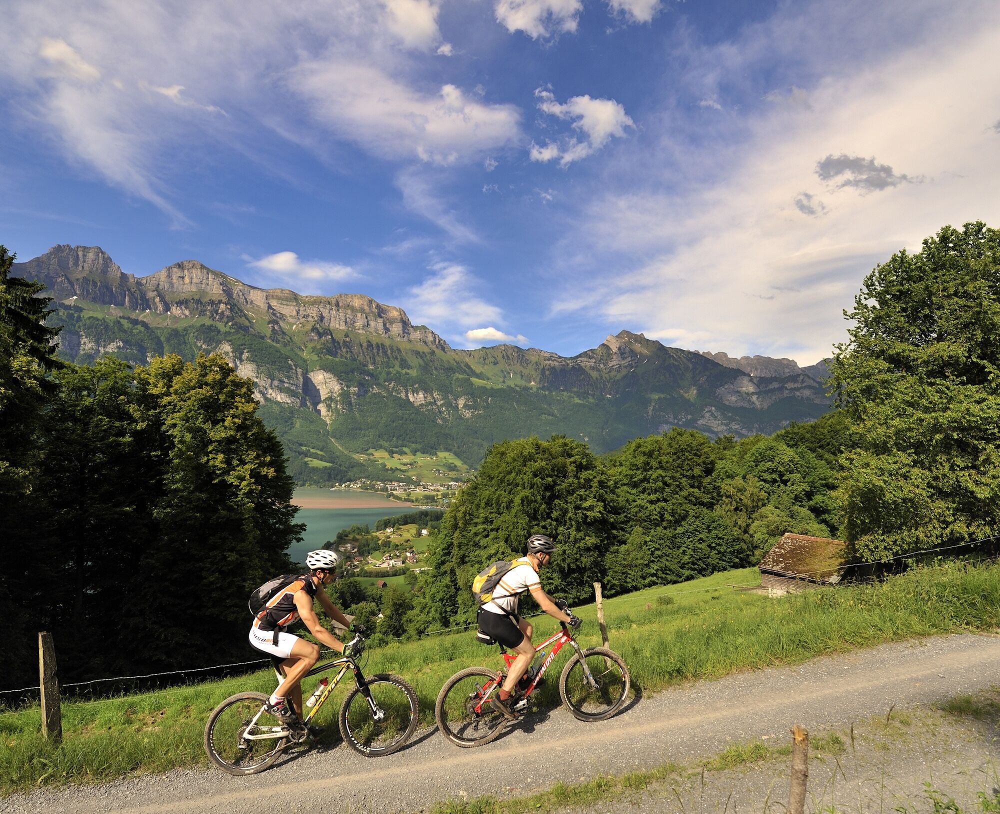 Am höchsten Punkt angekommen zweigt rechts eine Naturstrasse ab, welche die nächsten 400 Höhenmeter steil talwärts führt - ein Test für Fahrer und Bremsen. Nach der Überquerung des Murgbachs folgt ein gemütliches Ausrollen dem See entlang zurück nach Walenstadt. Unterwegs laden die Strandbäder in Murg, Unterterzen und Mols zum erfrischenden See-Bad ein.
