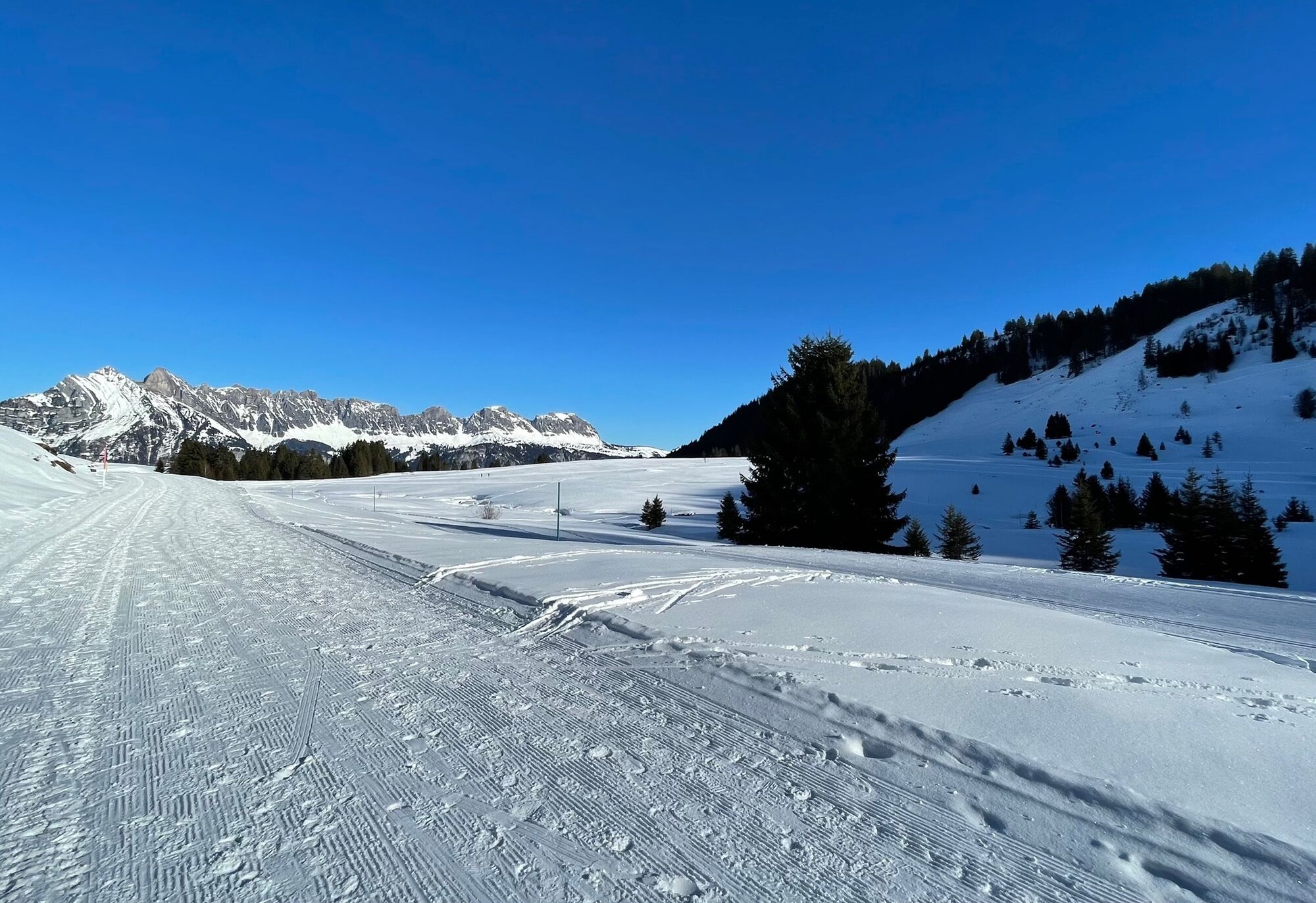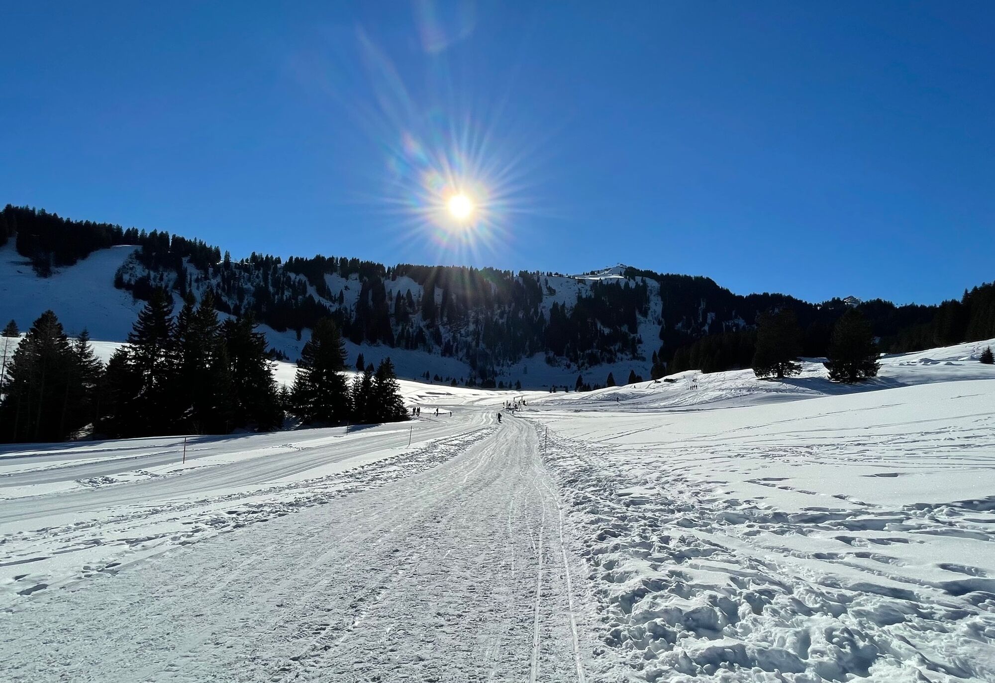 Start der Winterwanderung ist beim Restaurant Sennästube auf der Alp Tannenboden. Wir folgen dem Wegweiser Richtung Chrüz vorbei an den Kinderlift Madils und weiter auf dem Winterwanderweg bis zu Weggabelung....