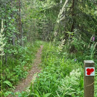 Reitti on merkitty maastoon punaisilla maalimerkeillä (punainen apilanlehti-merkki).