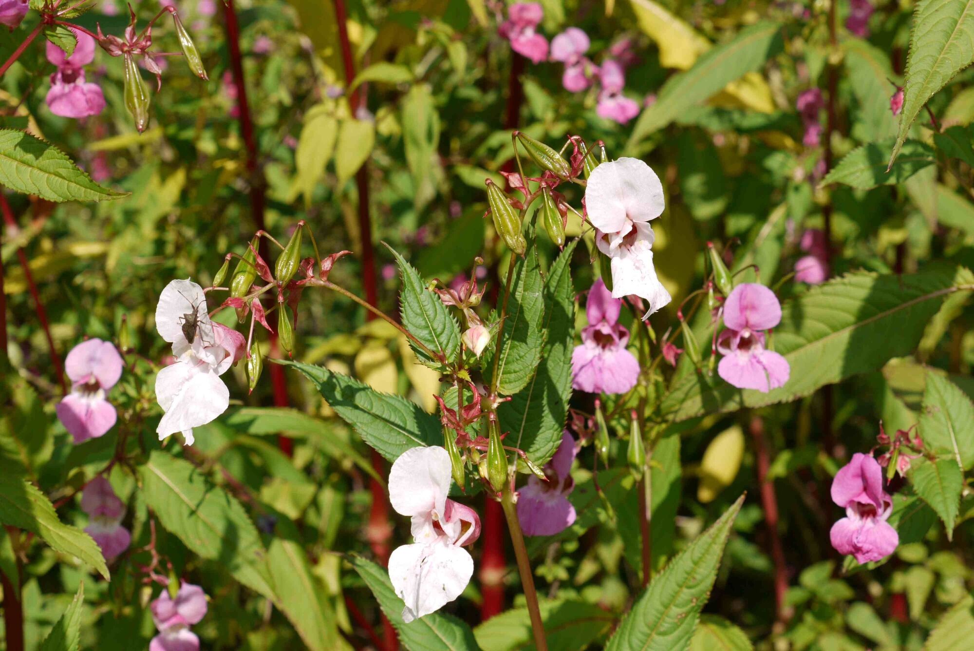 Wie es der Name schon verrät, gehört das Indische Springkraut nicht zu den hier heimischen Gewächsen. Vielleicht haben Sie die bis zu zwei Meter hohen Pflanzen schon anderswo in der Landschaft bevorzugt in feuchten Auen an Bächen und kleinen Flüssen gesehen. Auf der linken Seite des Wanderwegs verläuft durch die Ansammlung des Indischen Springkrauts eine feuchte Rinne – ein Quellbächlein, das in den Haselbach entwässert. Durch das fließende Wasser werden die Samen des Springkrauts weitertransportiert und lagern sich irgendwo auch wieder im Feuchten ab. Aber die Samen können auch, wenn die keulenartigen Kapseln aufspringen, bis zu sieben Meter weit fliegen. Die weitere Verbreitung dieser Pflanze ist somit sicher und dies zum Schaden niedrigerer heimischer Gewächse, denn das Indische Springkraut nimmt ihnen das Sonnenlicht. Fremde Pflanzen, die heimische Vegetation beeinträchtigen bis schädigen, nennt man Neophyten oder auch deutlicher invasive Arten.
