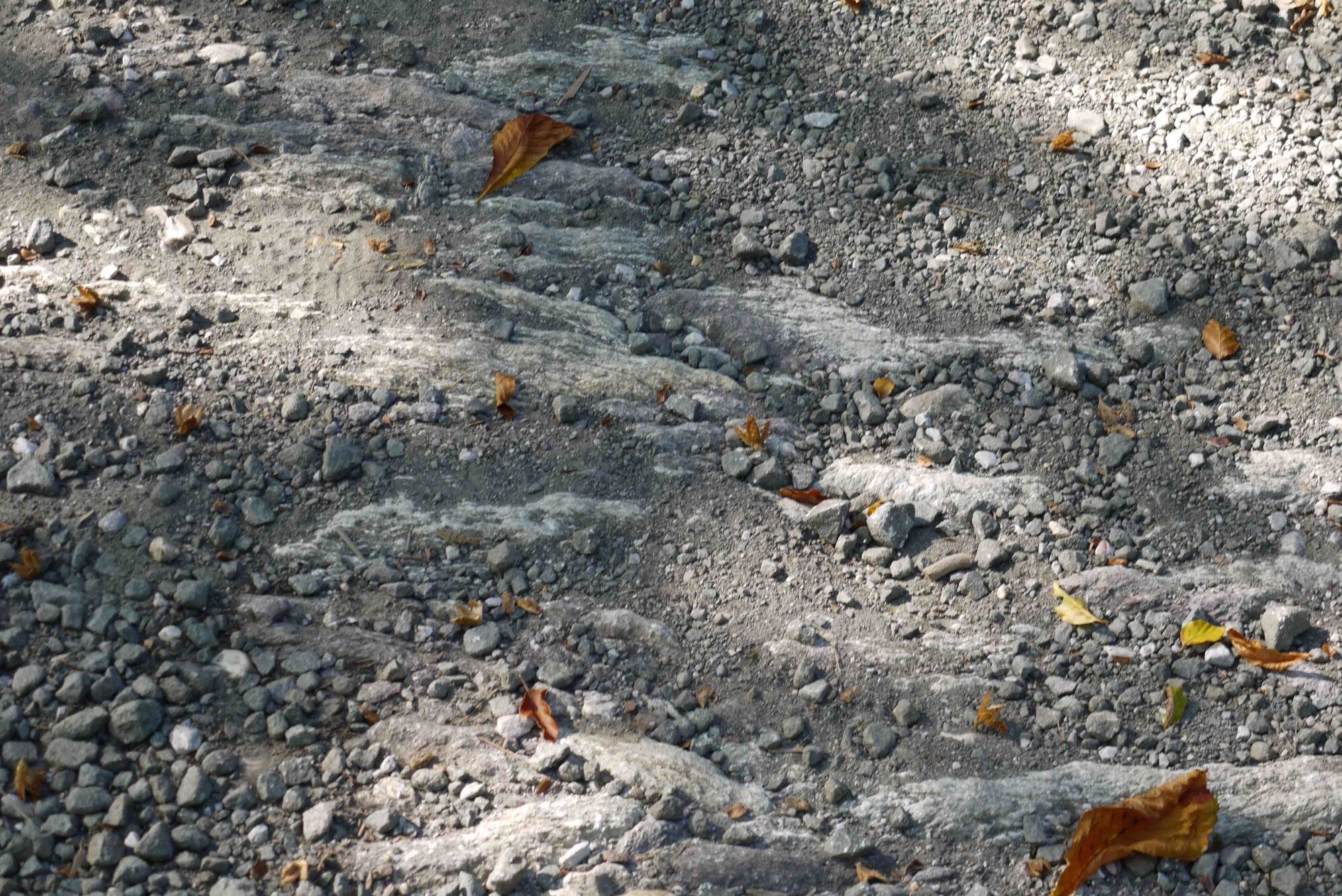 Nach einiger Zeit während des Abwärtswanderns fallen auf dem Weg kleine unregelmäßige Felsrippen auf. Wie kommt es zu diesem merkwürdigen Wegebelag? War es ein Bautrupp oder hat der Wegebelag einen vielleicht natürlichen Ursprung?