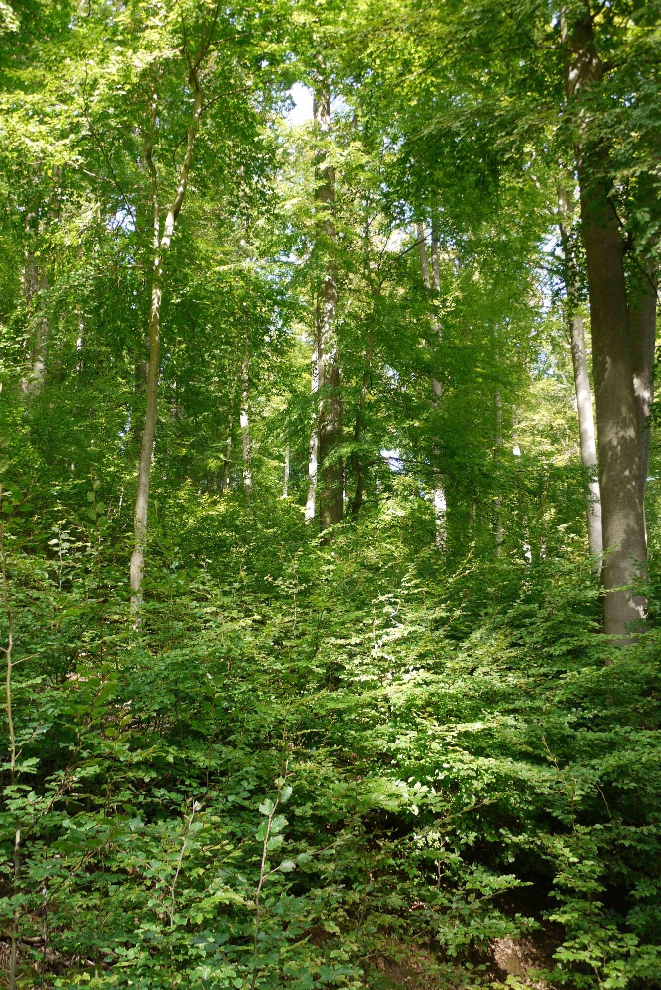 Auf dem weiteren Weg sieht man an mehreren Stellen, wie sich der Buchenwald von alleine verjüngt; der Buchen-Nachwuchs bildet fast schon einen kleinen Urwald. Schließlich kommt man noch an einem zugewachsenen Steinbruch vorbei. Bald trifft von links oben kommend der Schafsweg hinzu und beide Wege führen zur nächsten großen Waldwegekreuzung, an der auch noch der Eulenweg und der Rehweg hinzukommen.