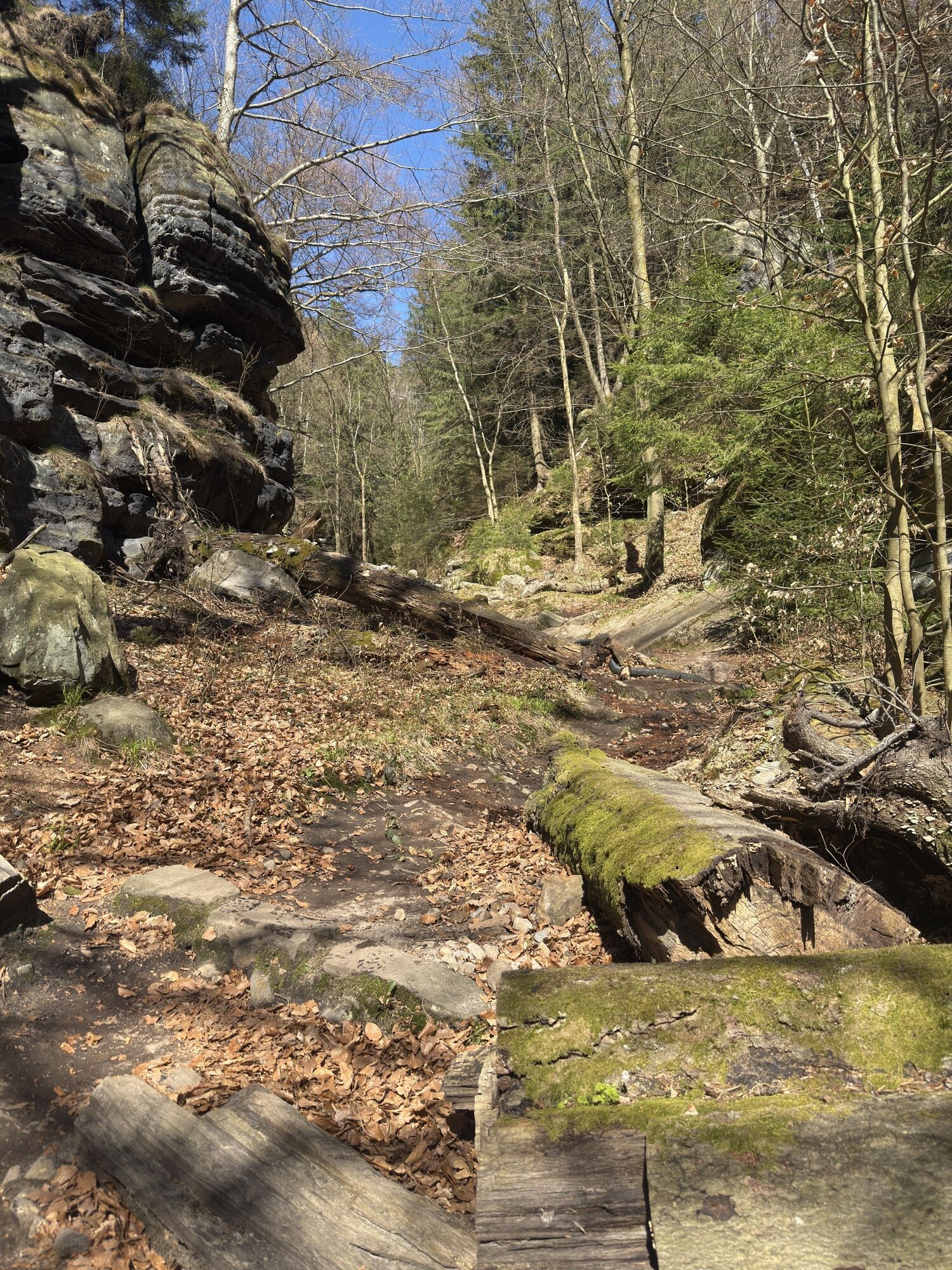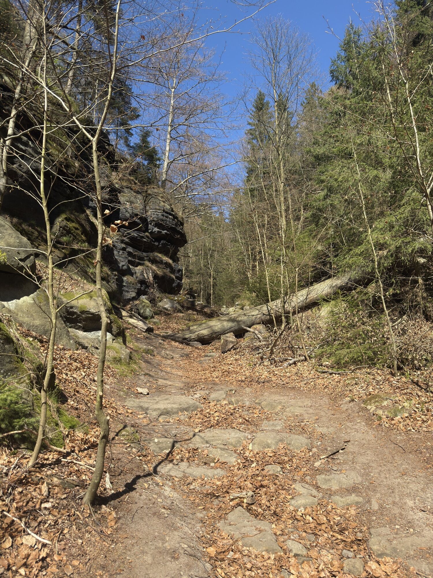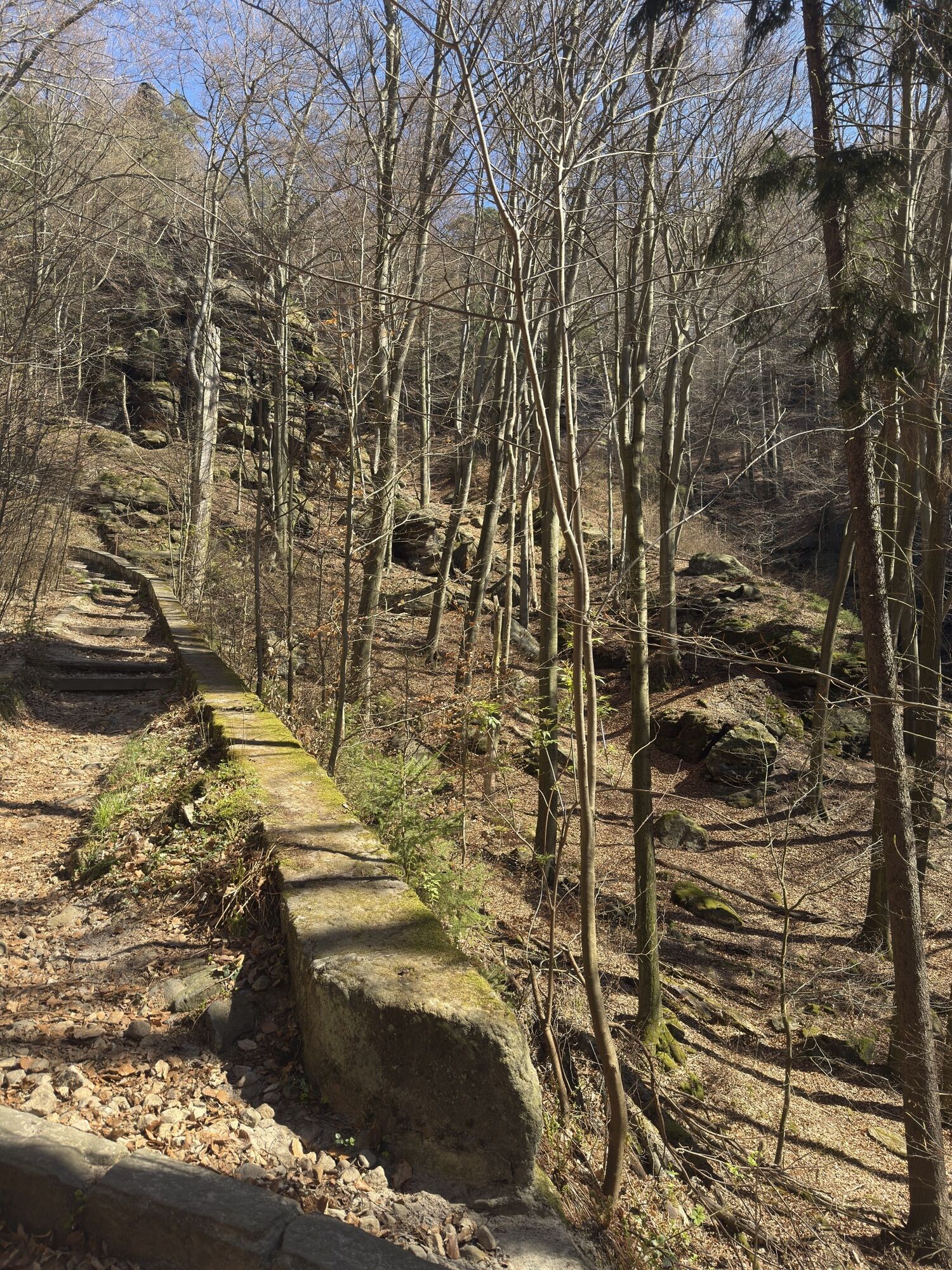 Doch erstmal ganz zum Anfang. Wenn man mit der S-Bahn und der Fähre auf der Schmilkaer Seite angekommen ist, führt einen der Weg gleich an netten Einkehrmöglichkeiten vorbei. Wenn man Glück hat, ist sogar die Mühlenbäckerei geöffnet und man kann sich etwas Proviant für den Weg kaufen. Zu viel Gepäck sollte aber nicht in den Rucksack wandern, denn es steht gleich zu Beginn ein guter Anstieg bevor. Auf der asphaltierten Winterbergstraße geht es bis zum Abzweig „Zwieselhütte“ stets bergan. Nun geht man weiter geradeaus, jedoch auf angenehmen Waldboden. Der Weg über die Heilige Stiege fordert zwar viel Ausdauer und Kraft in den Oberschenkeln, auf der anderen Seite wird man mit vielen kleinen und größeren Ausblicken belohnt. Wenig später folgt dann der ganz große Ausblick vom Carolafelsen. Von hier oben überblickt man fast die ganze vordere Sächsische Schweiz. Dabei fallen vor allem der Dom, der Falkenstein, die Schrammsteine und der Lilienstein ins Auge.