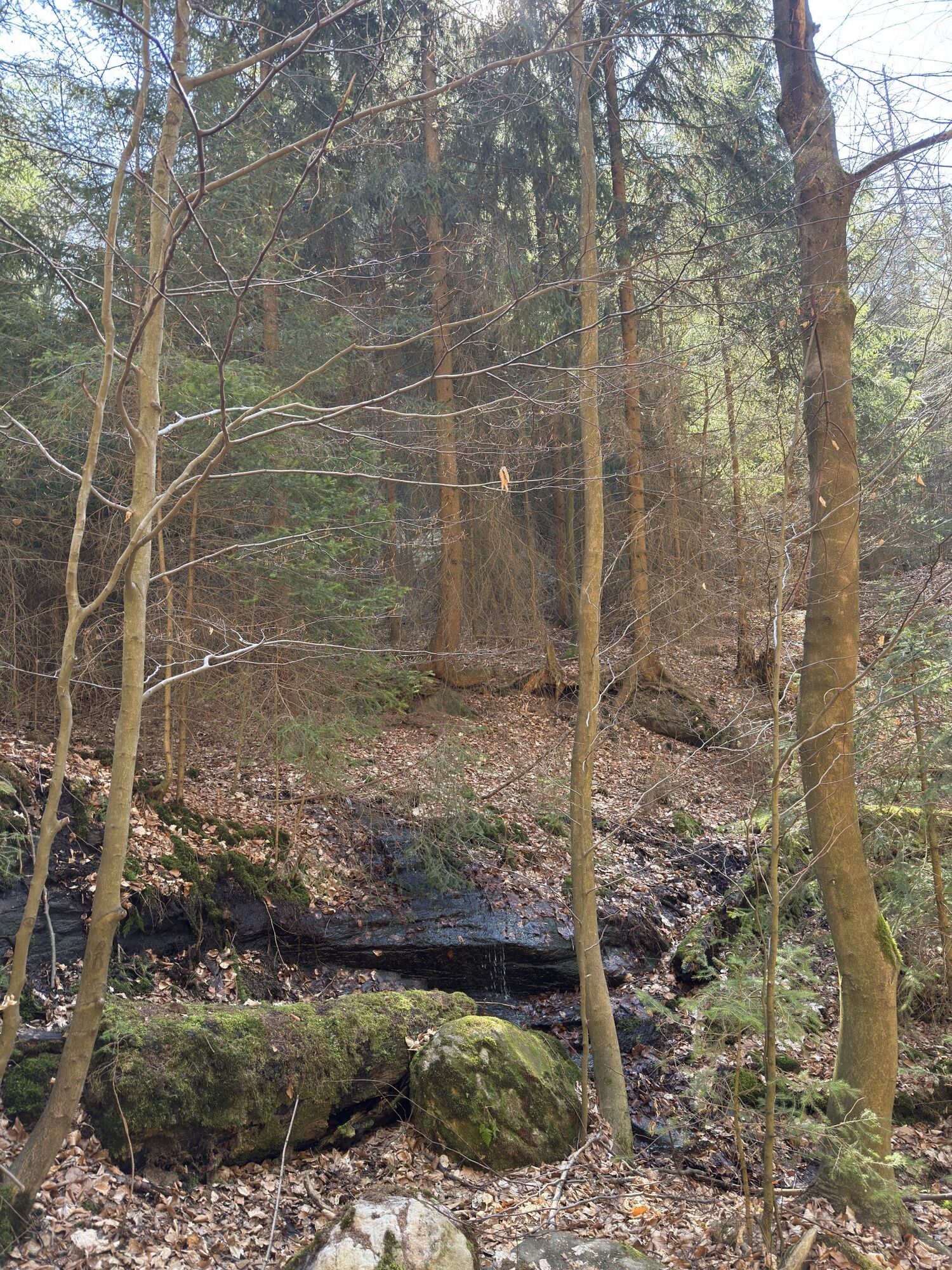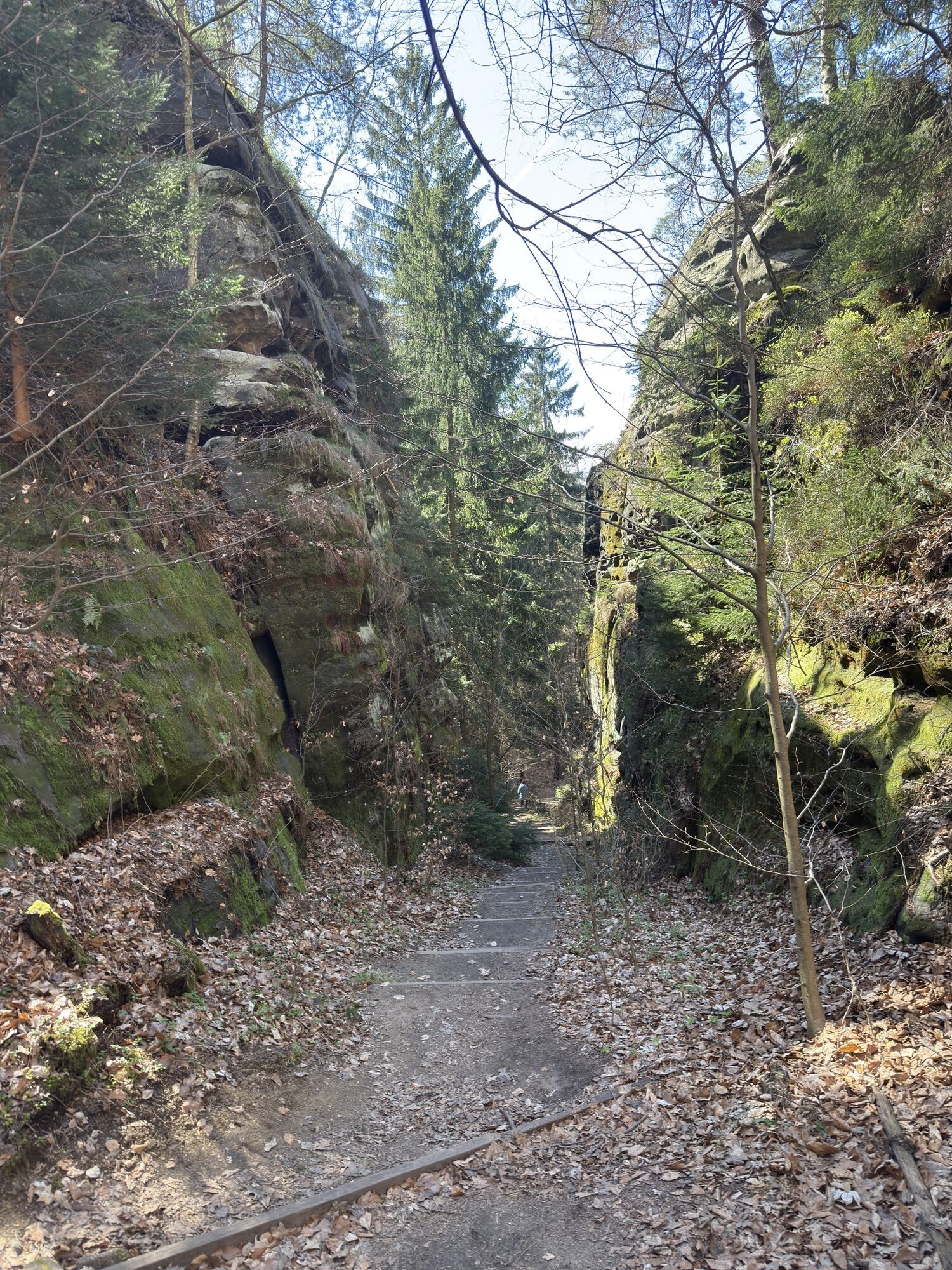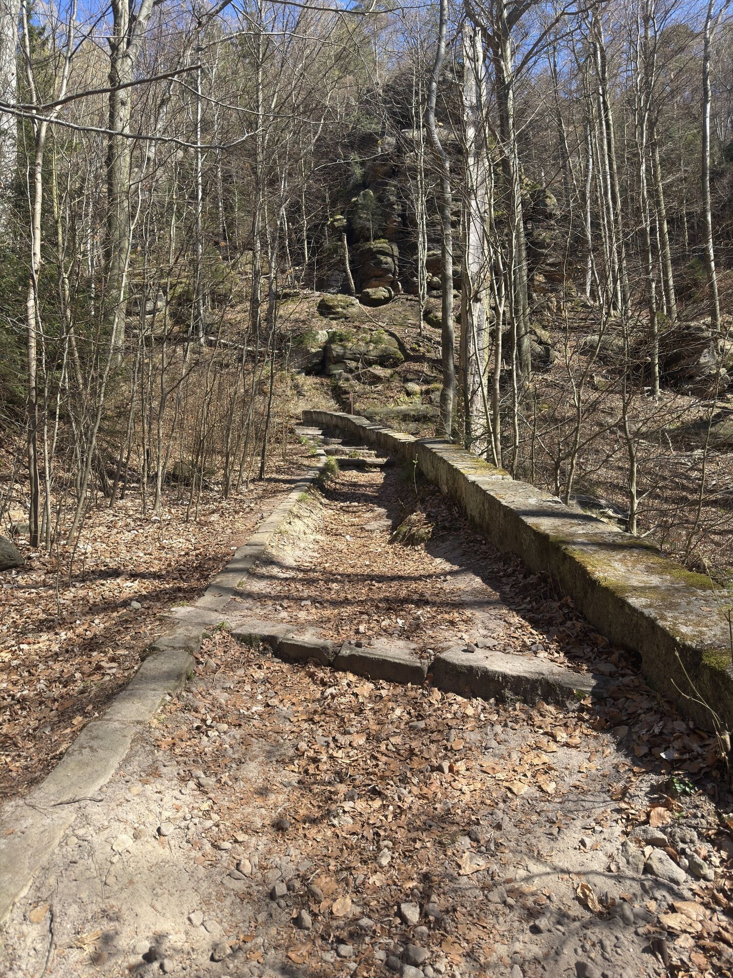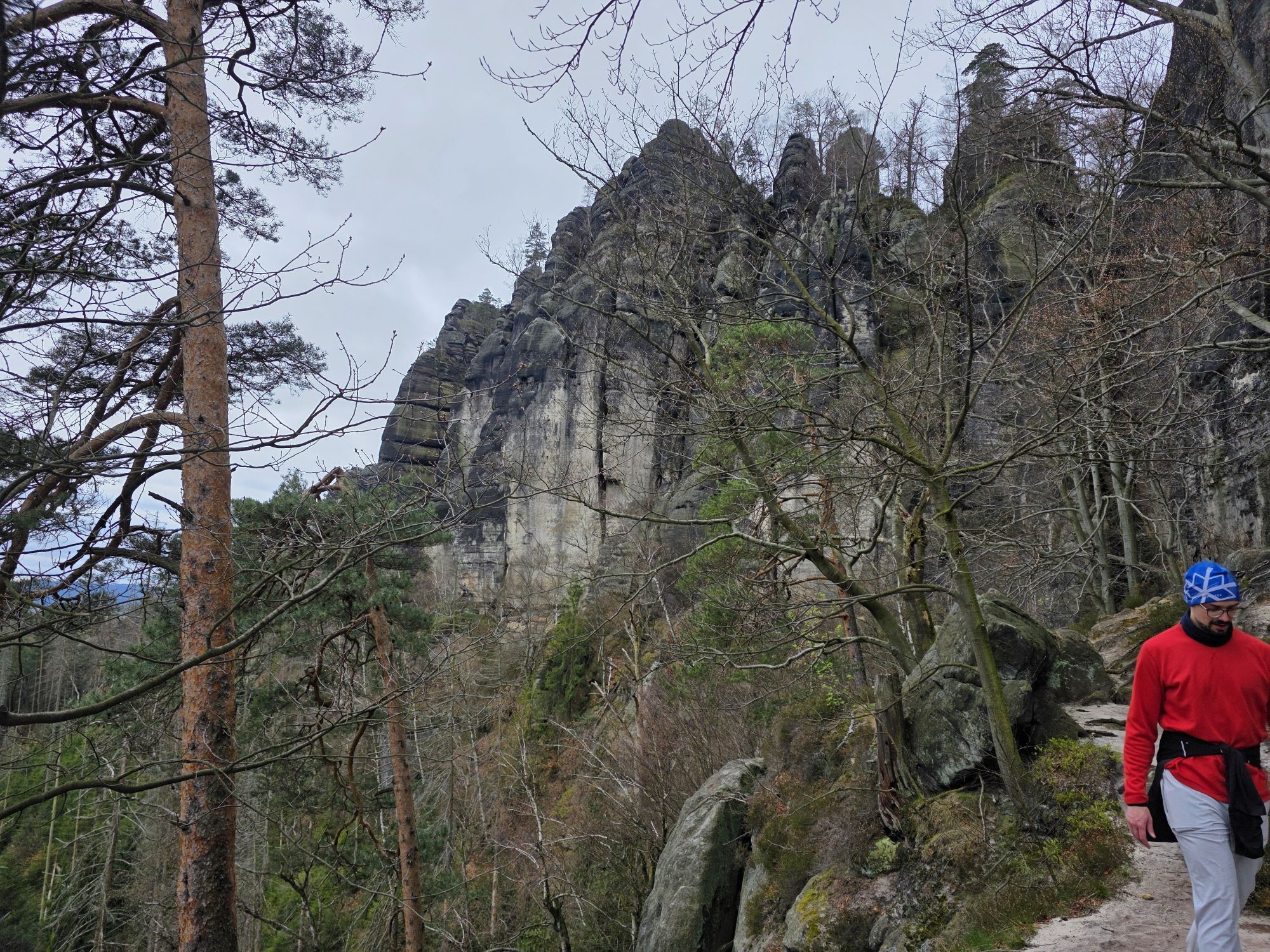 Doch erstmal ganz zum Anfang. Wenn man mit der S-Bahn und der Fähre auf der Schmilkaer Seite angekommen ist, führt einen der Weg gleich an netten Einkehrmöglichkeiten vorbei. Wenn man Glück hat, ist sogar die Mühlenbäckerei geöffnet und man kann sich etwas Proviant für den Weg kaufen. Zu viel Gepäck sollte aber nicht in den Rucksack wandern, denn es steht gleich zu Beginn ein guter Anstieg bevor. Auf der asphaltierten Winterbergstraße geht es bis zum Abzweig „Zwieselhütte“ stets bergan. Nun geht man weiter geradeaus, jedoch auf angenehmen Waldboden. Der Weg über die Heilige Stiege fordert zwar viel Ausdauer und Kraft in den Oberschenkeln, auf der anderen Seite wird man mit vielen kleinen und größeren Ausblicken belohnt. Wenig später folgt dann der ganz große Ausblick vom Carolafelsen. Von hier oben überblickt man fast die ganze vordere Sächsische Schweiz. Dabei fallen vor allem der Dom, der Falkenstein, die Schrammsteine und der Lilienstein ins Auge.