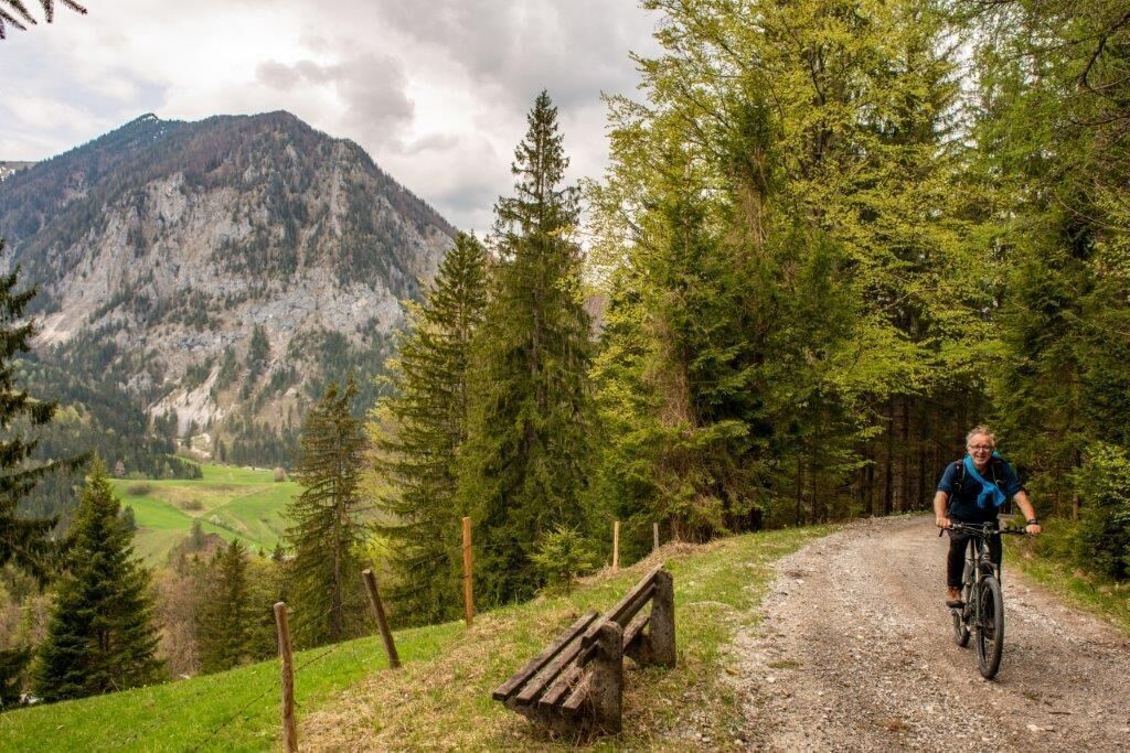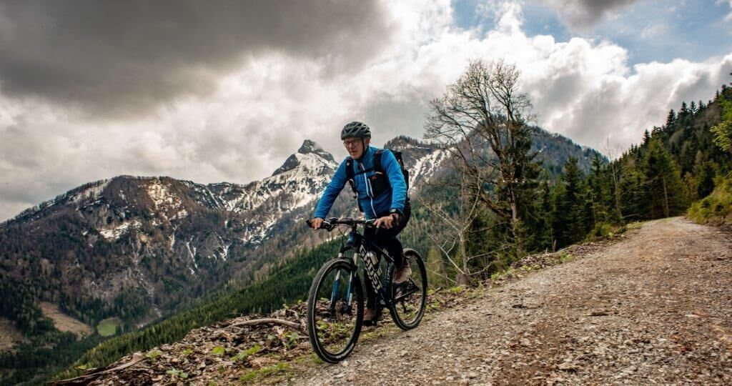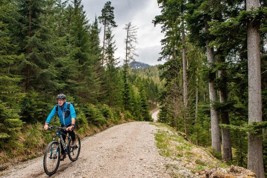 Hier fahren wir nur wenige Meter über eine Brücke und biegen sofort wieder scharf rechts in einer 180-Grad-Wende ab. Nun folgen wir bergauf der Forststraße bis auf den Schwarzsattel, der eine herliche Aussicht bietet. Ab jetzt geht es nur mehr bergab über die Stockingeralm bis nach St.Gallen. Die Beschilderung führt uns direkt ins Ortszentrum, das auch Ausgangspunkt unserer Tour war.