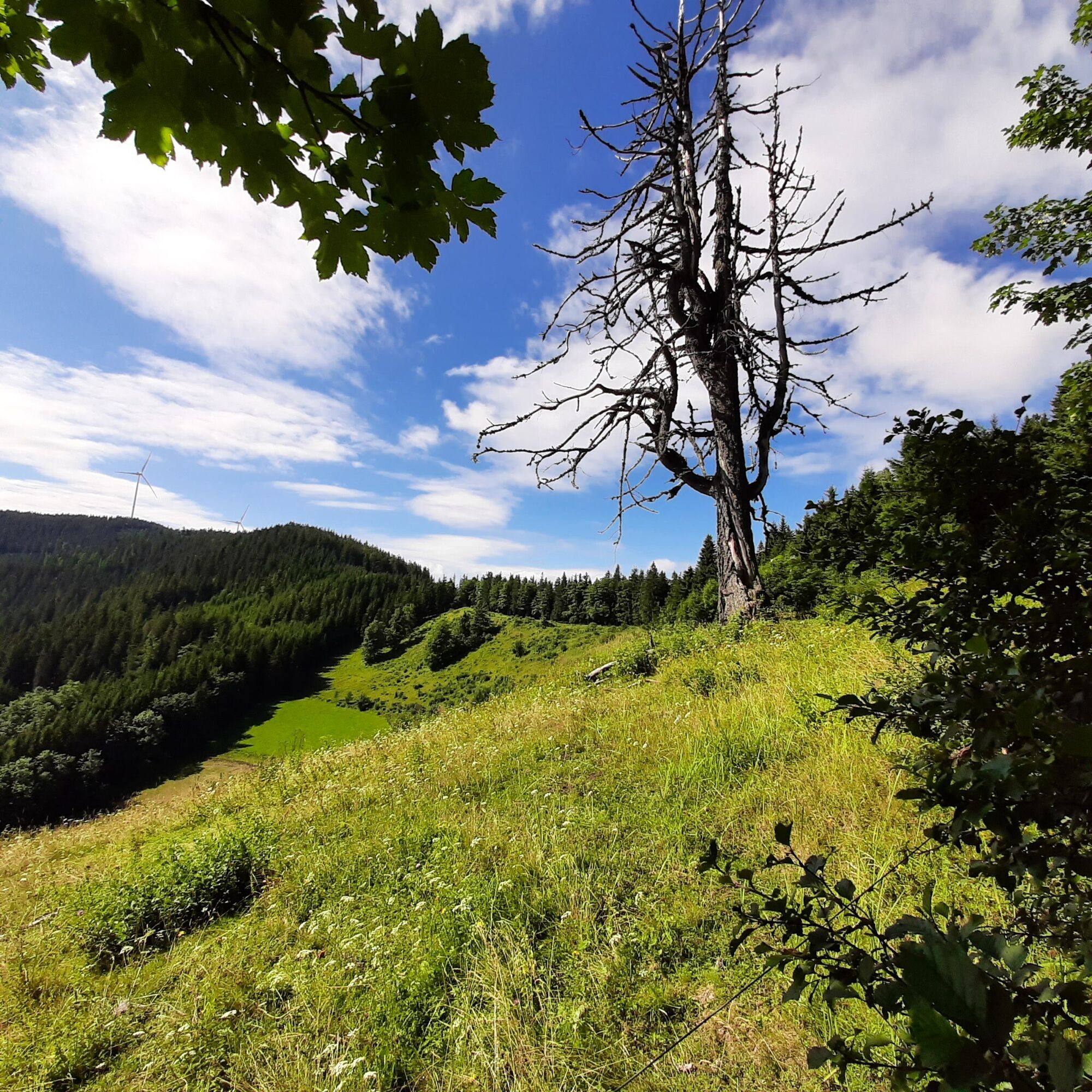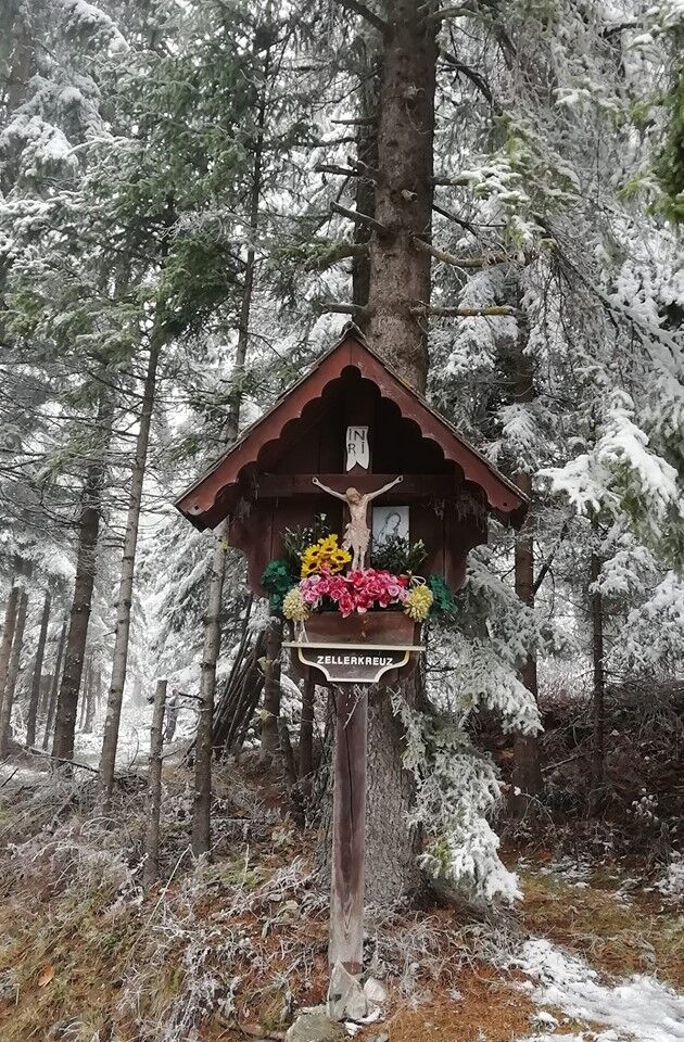 Wir starten die Tour beim Wanderstartplatz in Fischbach.In unmittelbarer Nähe des Gasthofes "Zum Forsthaus" biegen wir von der Straße ab. Ein gelber Wegweiser in Richtung "Herrnalm" dient zur Orientierung.Wir gehen am Badeteich vorbei bis zu einem Marterl.Hier geht es über eine Wiese leicht bergab und gleich darauf auf einer Forststraße wieder bergauf.Mit weiß-rot-weißen Markierungen und Wandertafeln wird man an Haus- und Hofstellen vorbei- bzw. hindurchgeschickt.Wir biegen rechts bei der Abzweigung in Richtung "Waldandacht" und "Herrnalm" ab.Durch den Wald geht es auf die Asphaltstraße.Nach einem Bauernhof gehen wir nach links unten und gelangen über Wiesen und Wald beim Waisenschmid an.Wir gehen direkt auf das vor uns liegende Wohnhaus zu und halten uns leicht links über die Wiese, wobei wir uns an den Markierungen am Strommast orientieren.Nach der Steigung im Wald folgen wir nach einer großen Wiese der Forststraße bis zu einer Asphaltstraße.Nun geht es links leicht bergab, bis kurz vor dem Bauernhof rechts eine gelbe Tafel mit "Herrnalm" uns die Richtung zeigt.Über Wanderwege und Forststraßen steigt es stetig bergauf, bis wir bei der Herrnalm angelangt sind.Wir halten uns Richtung Fürstkogel und folgen dem Zentralalpenweg (02) und Mariazellerweg (06) bis zum Alpengasthof Schanz.Auf der Schanz angekommen führt der Wanderweg Nr. 740 und ein Teil am Alpannonia Weitwanderweg zum Zeller Kreuz. Beschilderung "Zeller Kreuz"Von hier geht es über die Gmoa am Wanderweg mit der Nr. 8 zurück nach Fischbach.