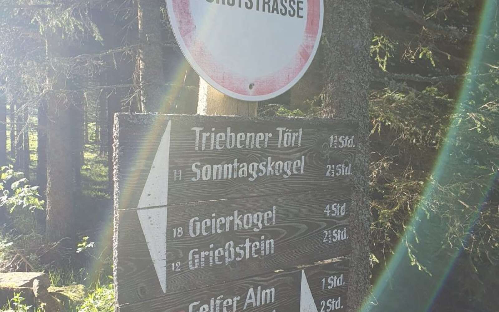 Vom Parkplatz Bärntal ausgehend dem Wegweiser Richtung "Sonntagskogel" folgen. Die Tour verläuft anfangs auf dem Forstweg und geht dann bald in einen markierten Steig über, wobei man den Bärntalbach mehrmals auf Stegen und Überstiegshilfen überquert. Nachdem man nach ca. 1,5 Std. das Triebener Törl erreicht hat, folgt man dem Steig links in Richtung Sonntagskogel, zur rechten erhebt sich der Große Grießstein.