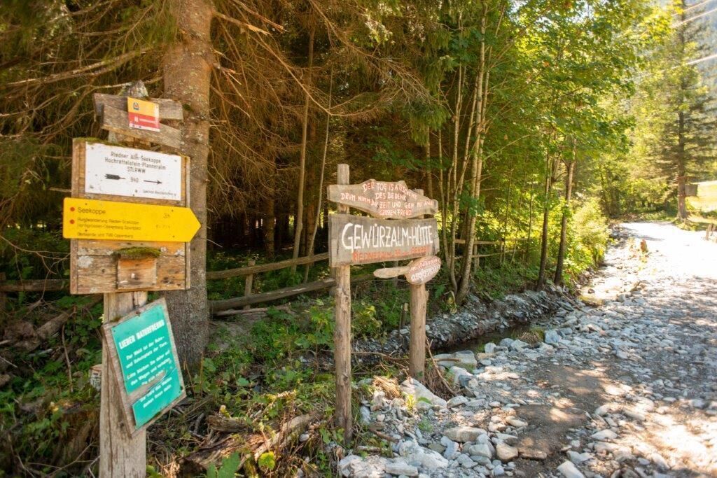 Start ist ei der großen Hinweistafel "Gewürzalm-Hütte"