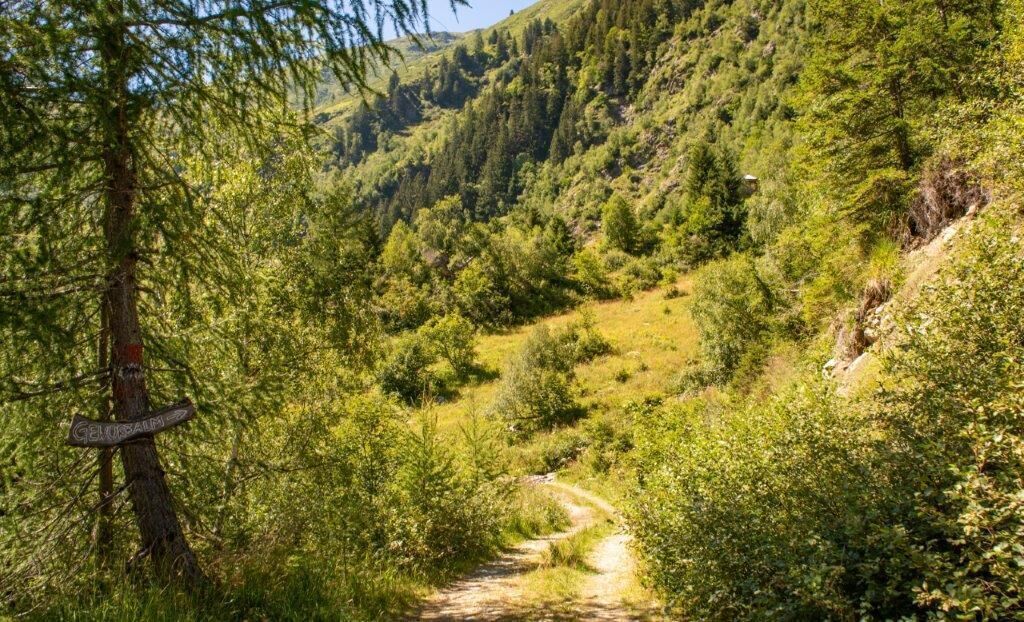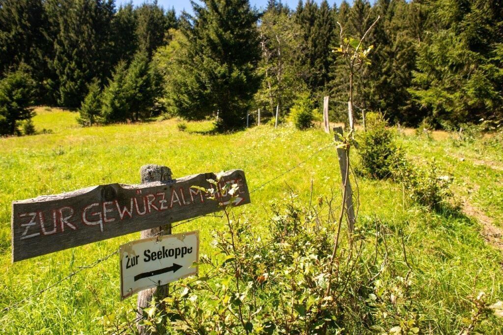 Vom Parkplatz steigen wir über Wiesen hoch - immer der rotweißroten Markierung folgend . Der Steig beginnt gleich ordentlich anzusteigen und mündet in einen steilen Waldhohlweg, der uns ins Hochtal hinauf bringt, über dem die "Seekoppe" thront. Der Steig mündet in eine Forststraße, auf dieser wandern wir gemütlich zur Gewürzalm Hütte.