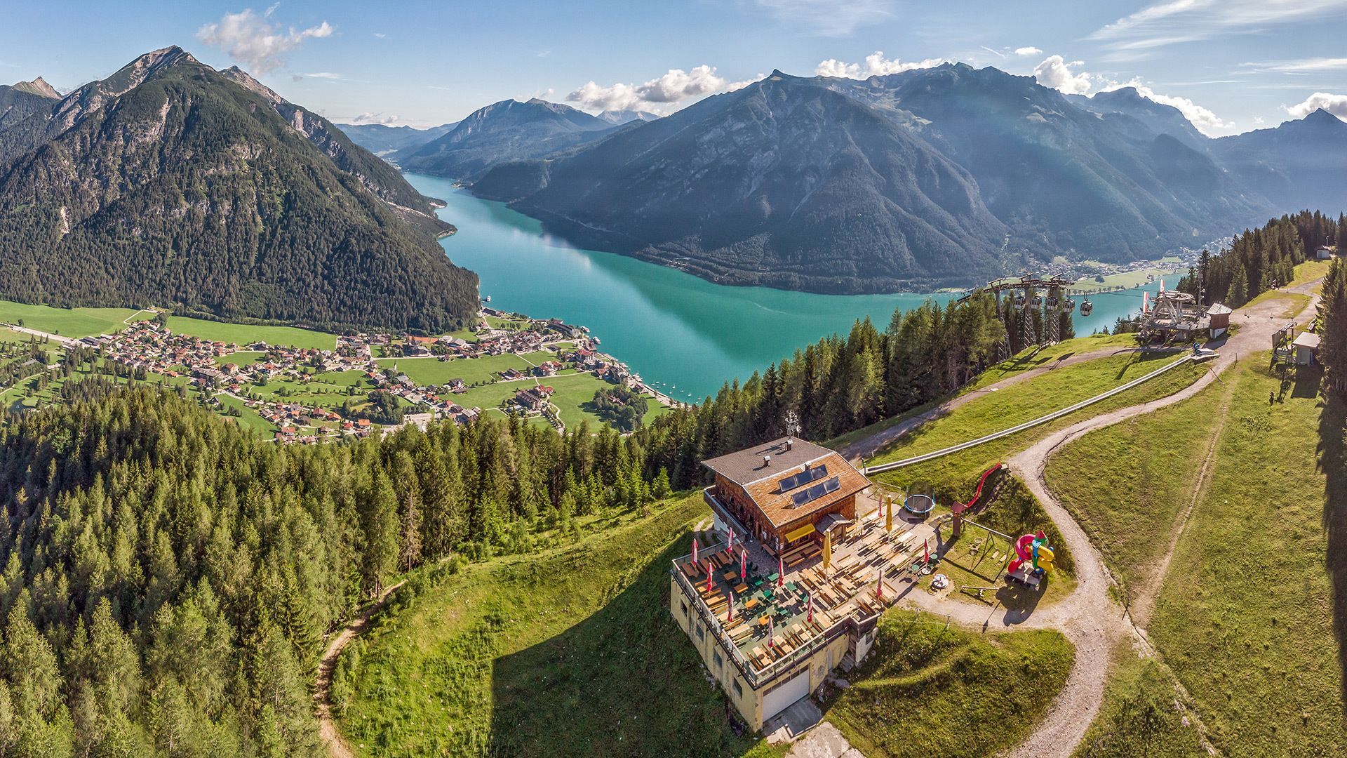 Bei der Ortseinfahrt von Pertisau die erste Straße links bergauf in Richtung Karwendel-Bergbahn nehmen. Die Bergbahn liegt nach ca. 750m auf der linken Seite. Auffahrt mit der Bergbahn.