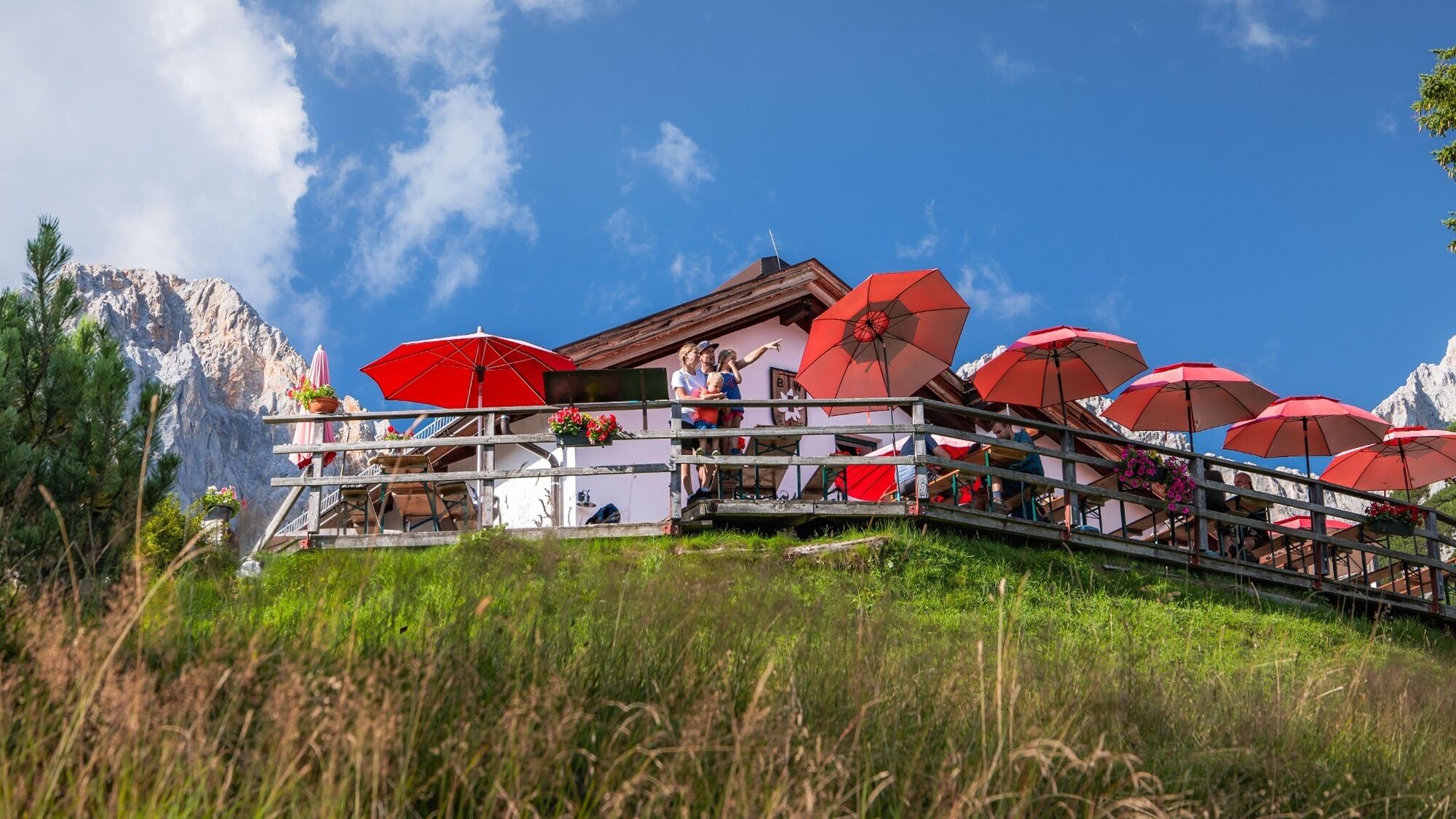 Nach dem anstrengenden Aufstieg an Tag 1 zeigt Etappe 2 ein ganz anderes Gesicht. Mit deutlich weniger Höhenmeter bleibt hier viel Zeit, um das Panorama des Wettersteingebirges so richtig aufzusaugen. Dieser Weg ist bekannt für Wildtiersichtungen und bietet dementsprechend ein echt authentisches Naturfeeling. Ziel der Etappe ist die mit 2.030 m höchstgelegene Hütte im Wetterstein: die Rotmoosalm. Besonders unter Einheimischen beliebt ist die Rotmoosalm – einer der schönsten Plätze der Region. Von der Aussicht über die Verköstigung bis hin zu den Wirtsleuten – die besondere Atmosphäre der Rotmoosalm muss man einmal erlebt haben. Für die Kinder gibt’s sogar einen eigenen Spielplatz.