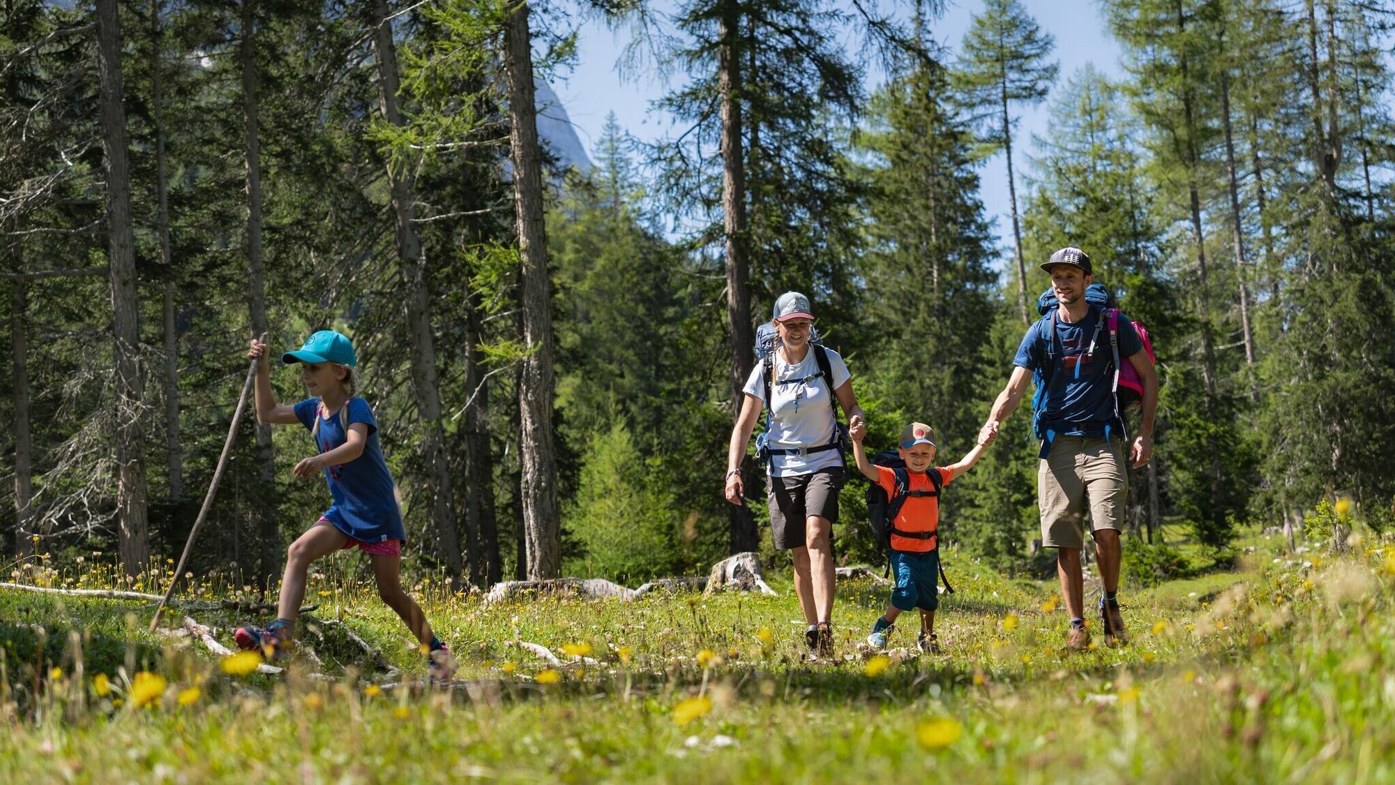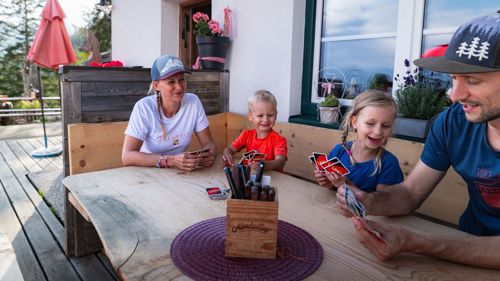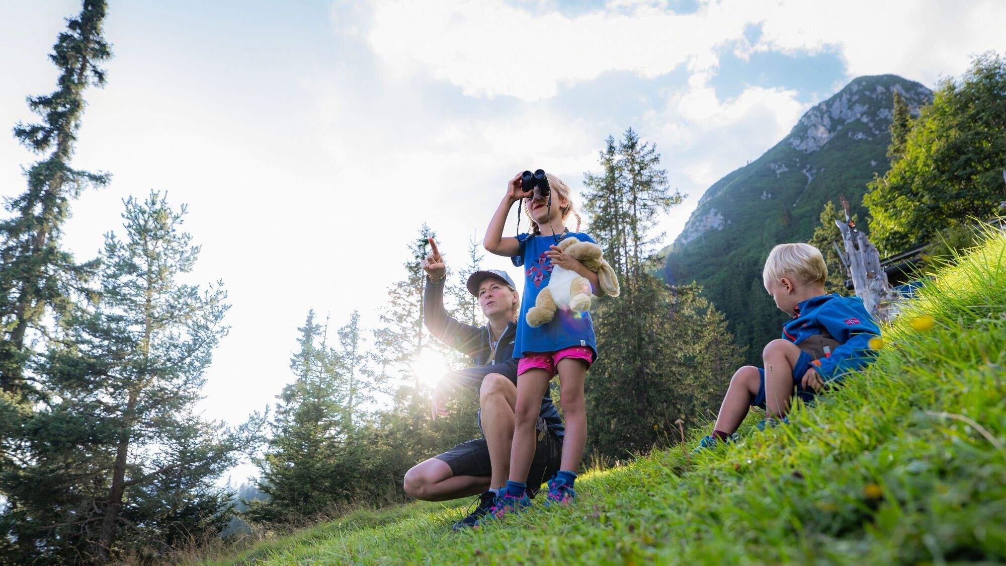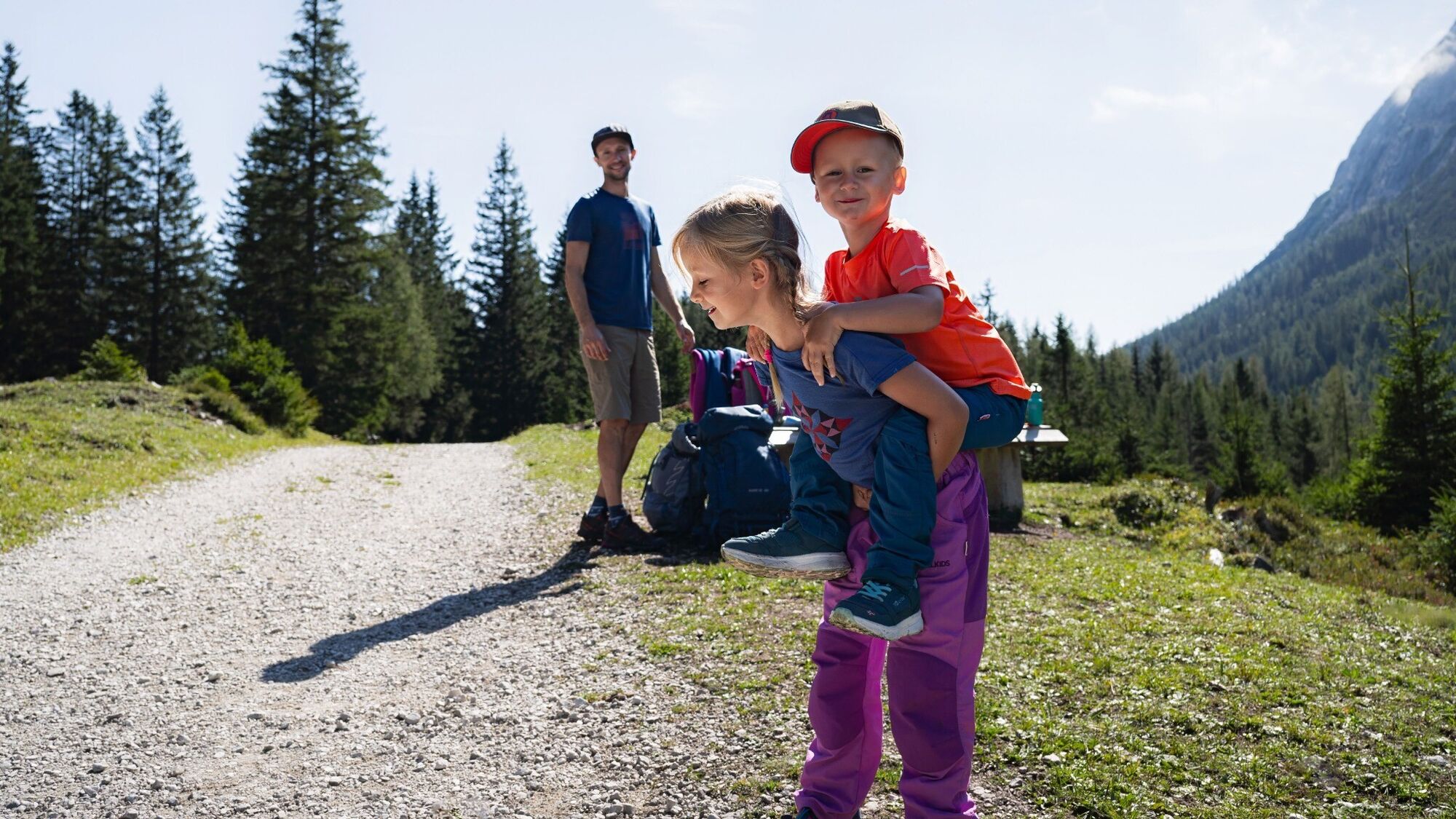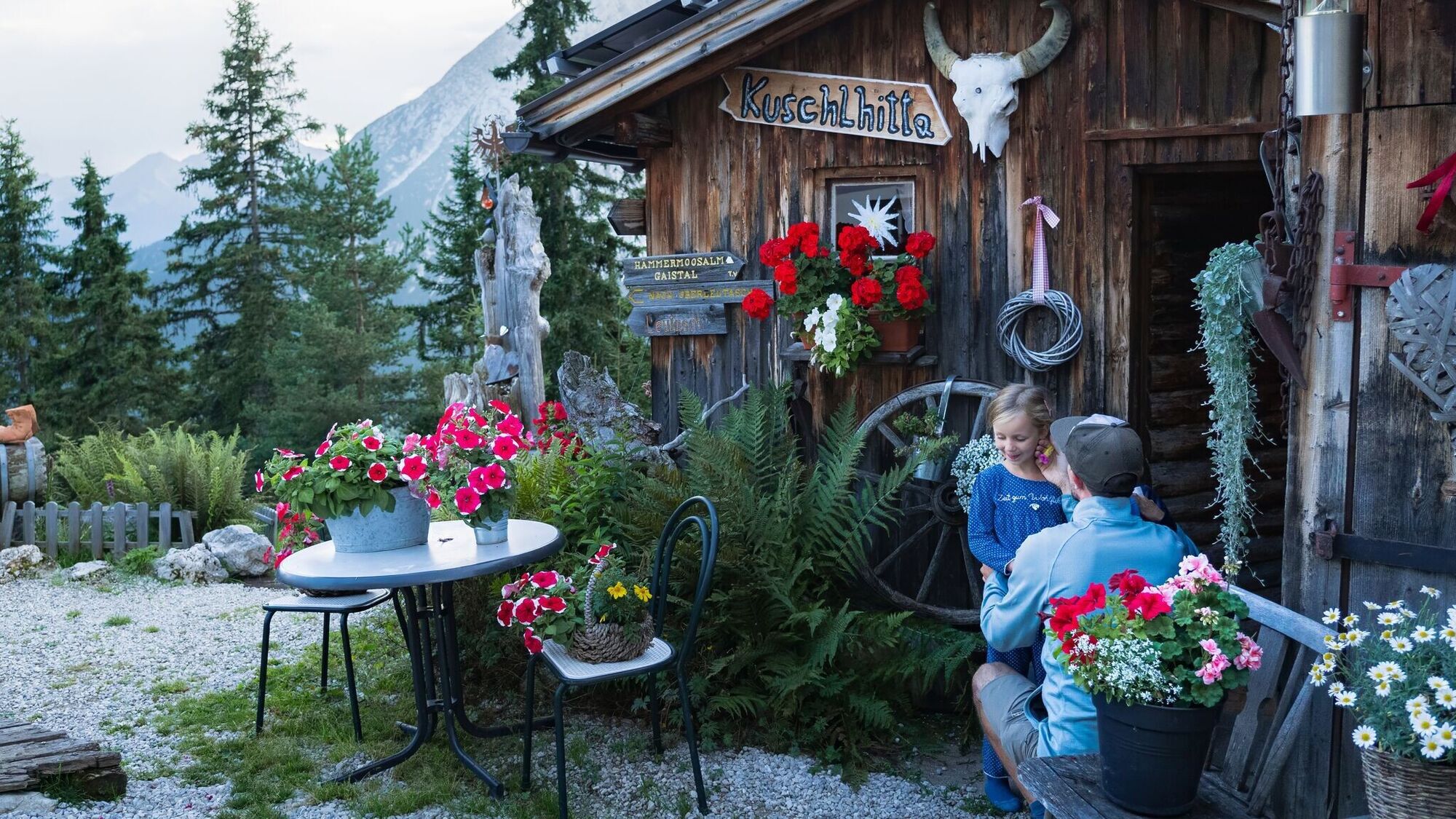 Von Leutasch aus geht es an Tag 1 über rund 550 Höhenmeter hinauf zu den beiden wunderschönen Hütten namens Wettersteinhütte und Wangalm. Beide verfügen über beispielloses Panorama, traumhafte Tiroler Köstlichkeiten und gemütliche Übernachtungsmöglichkeiten, darunter die einzigartige „Kuschlhitte“ bei der Wettersteinhütte. Der abwechslungsreiche Weg führt teilweise durch Waldstücke und lässt wenig später wieder Ausblicke auf die Hohe Munde und die umliegenden Berggipfel zu. Auf Etappe 1 ist viel Platz für Spaß und Spiele, um die Jüngsten bei Laune zu halten.