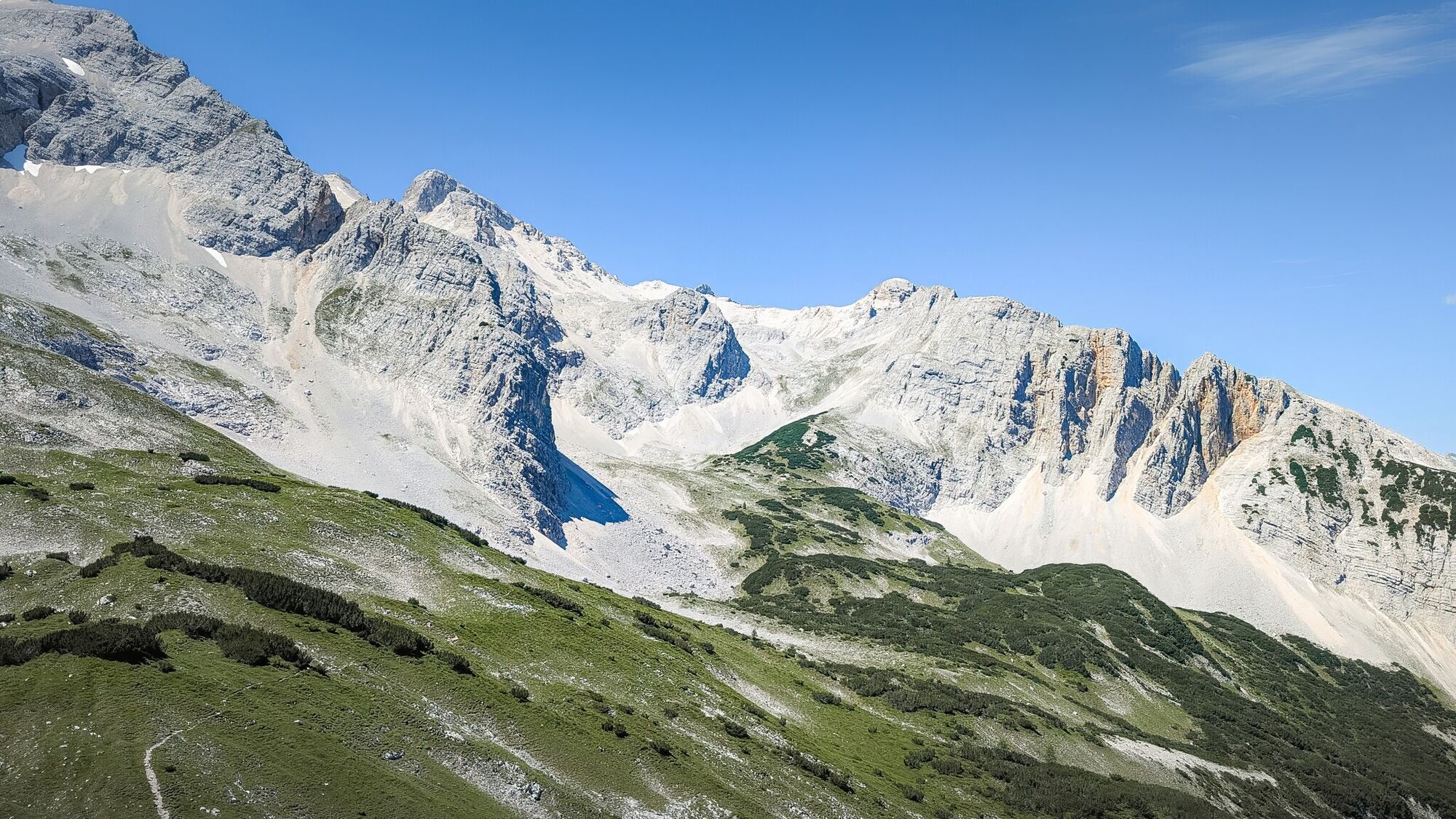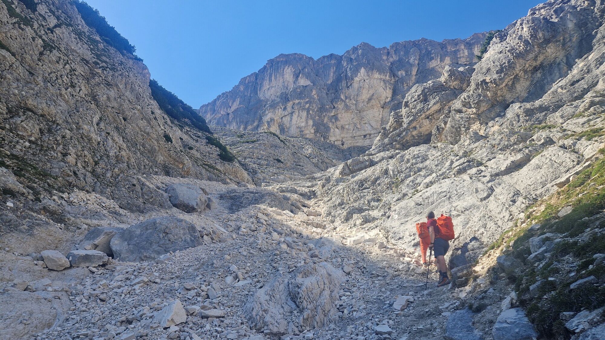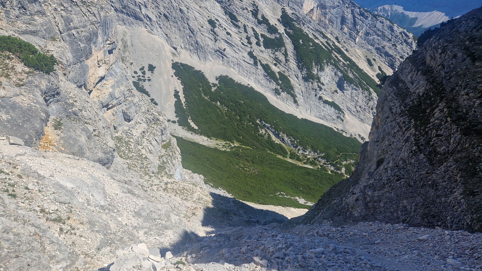 Nach der Querung führt der der Weg zunächst ein Stück abwärts, dann links mit neuer Drahtseilsicherung um einen Rücken herum und in eine Schotterrinne zum Abstieg. Dieser Rinne folgt man ca. 60 m über ein Geröllfeld weglos abwärts, links unten geht es auf dem wieder sichtbaren Weg weiter insHinterkar. Auch diese erste weglose Passage sollte als Hinweis auf den weiteren Wegverlauf gesehen werden. Gute Sichtverhältnisse und Orientierungsvermögen sind trotz der Markierungen (Farbpunkte, Steinmänner, Stangen) notwendig, da diese z. B. nach Unwettern fehlen können. Es gibt immer wieder weglose Passagen und solche, an denen der Steig nicht breit ausgetreten ist. Achtung:Im Karwendel fehlt zudem in vielen Bereichen die Telefonnetz- und Internetabdeckung. Karten und offline Navigationsmöglichkeiten sowie eine Notruf-App, die ohne Netzabdeckung funktioniert, sind daher dringend erforderlich.