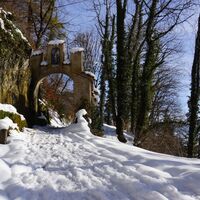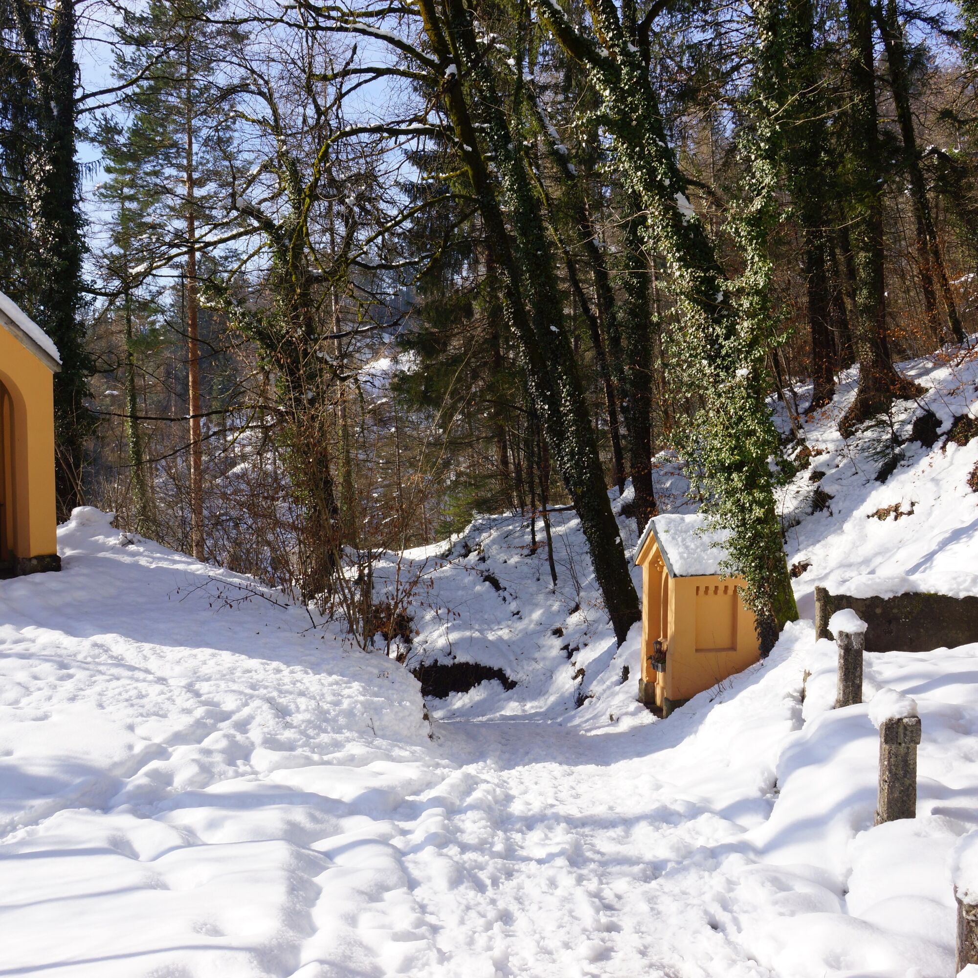 Auf dem steilen Kreuzweg mit seinen Grotten durch den romantischen Torbogen zum Romedius-Kirchlein (793 m). Schöne Aussicht auf Inntal, Mittelgebirge, Tuxer- und Stubaier Alpen.