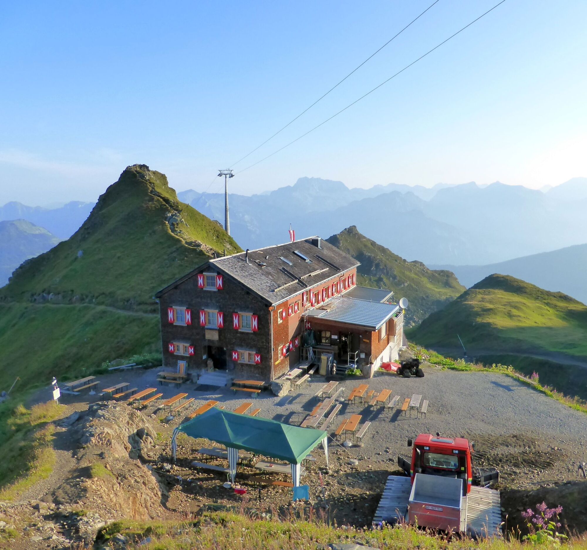 Gestartet wird in Schruns. Die ersten Höhenmeter machen Sie mit der Hochjoch und Sennigrat Bahn. Wir empfehlen Ihnen die Bahn um 15.30 Uhr zu nehmen. Wir empfehlen Ihnen die Aufstiege mit der Bahn zu machen, denn die Wanderung am nächsten Tag wird sehr lange werden. Von der Bergstation des Sennigrat Sesselliftes erreichen Sie die Wormser Hütte nach gemütlichen 15 min.